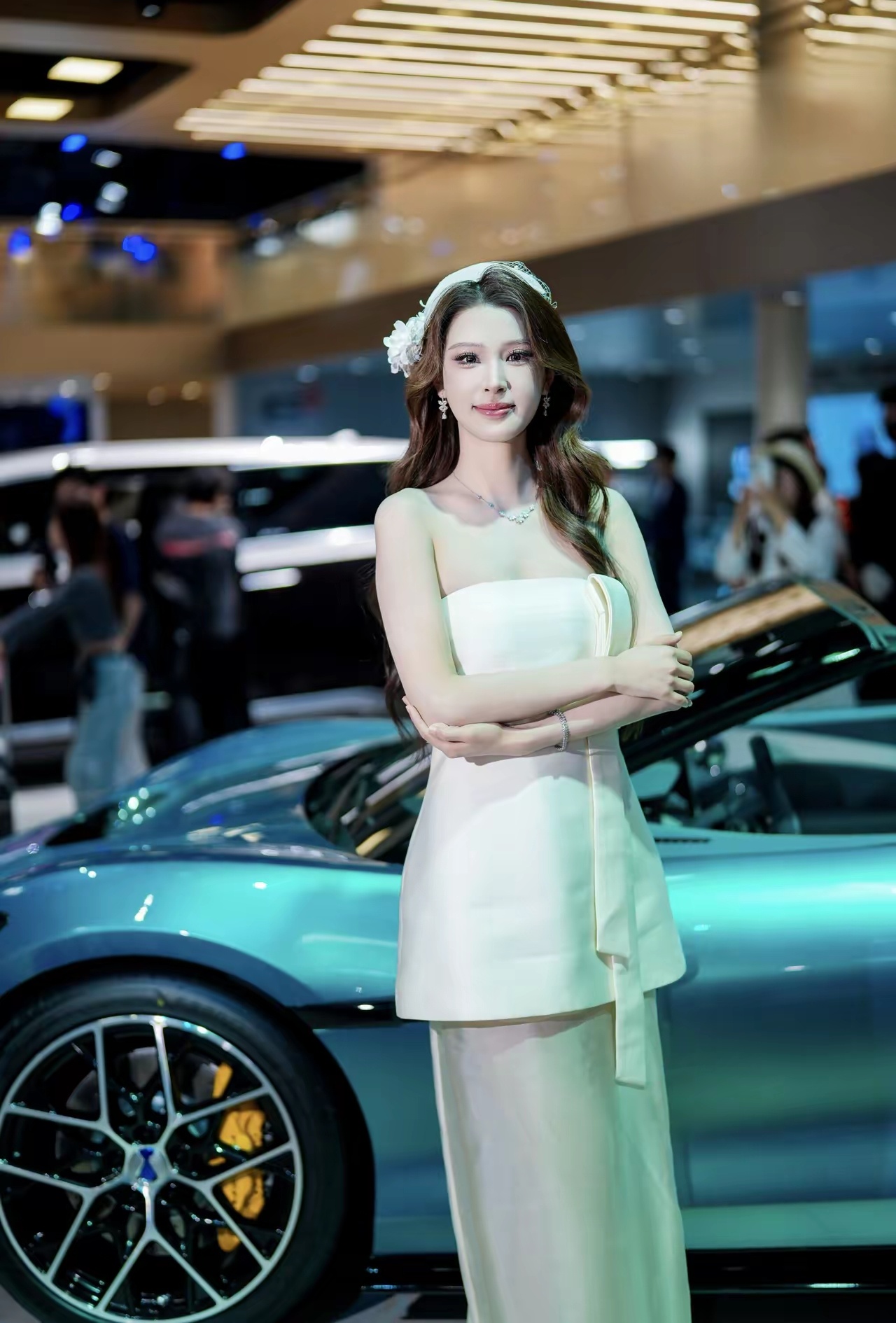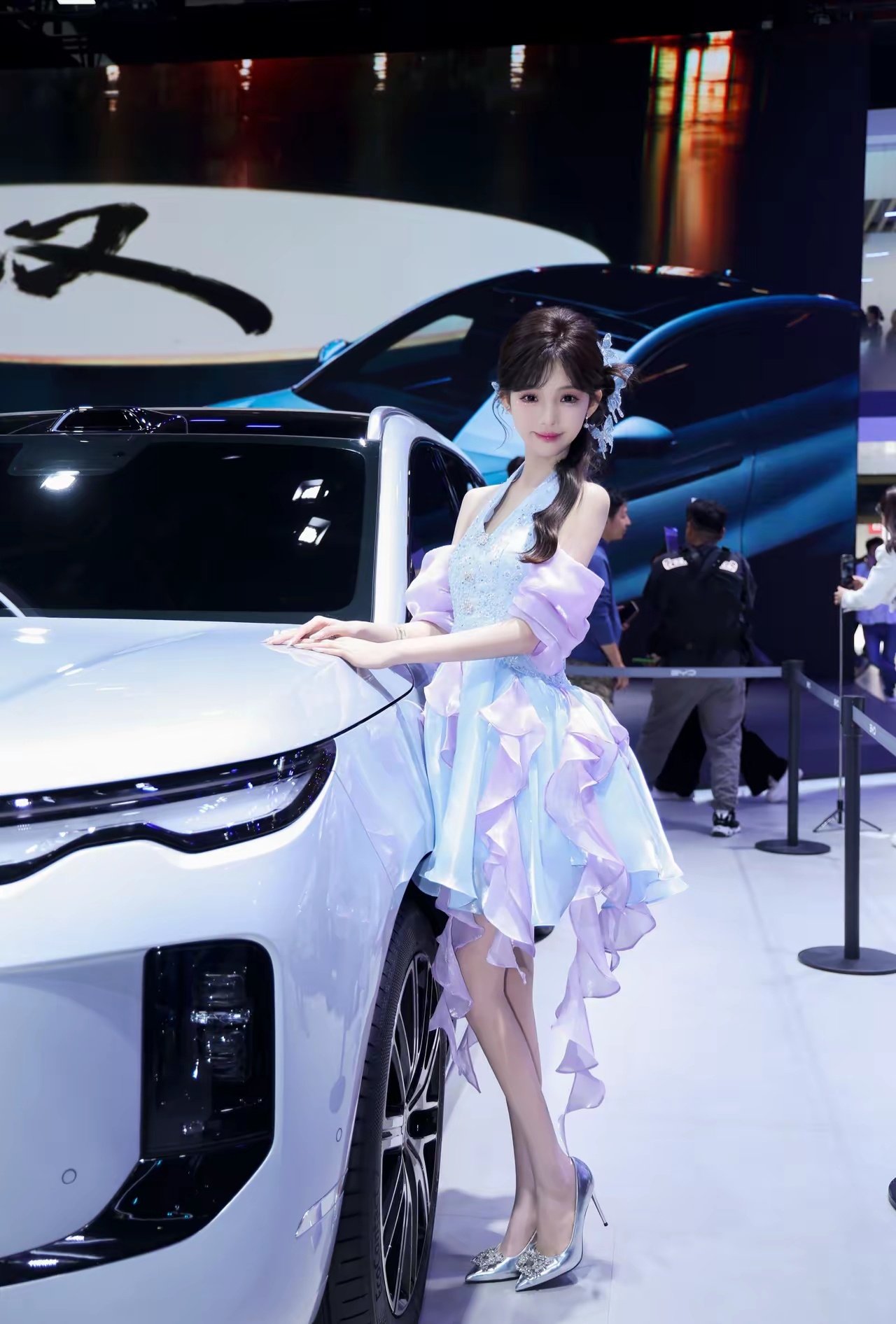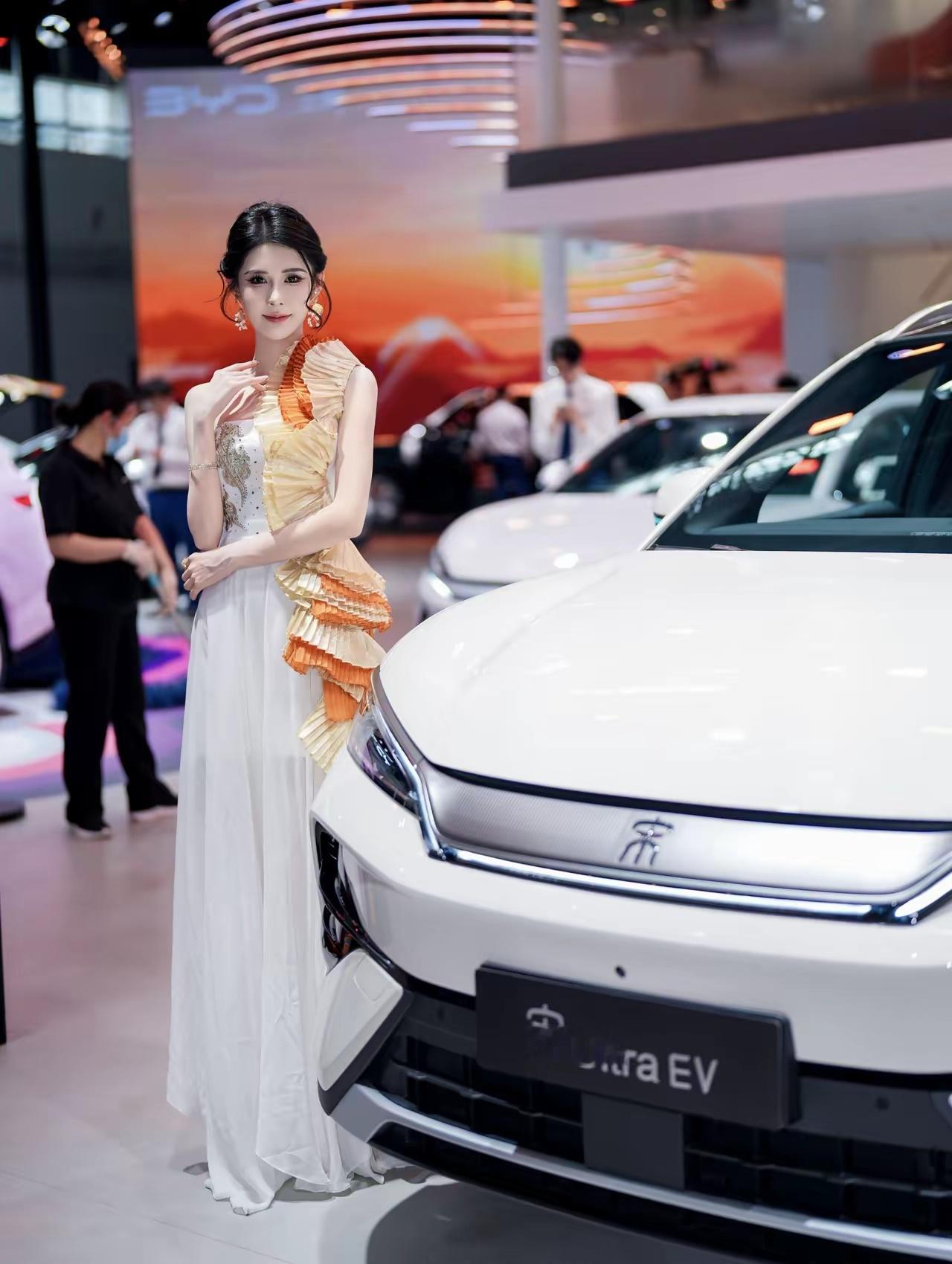 我也去了,本来是冲着车子去的,谁知道进入以后,直接被比亚迪模特的服装圈粉了。王朝那组山形压褶裙摆,站在新元PLUS旁边,线条像山脉起伏,大气又不刻意。海洋那边海浪刺绣配概念车,灵动得风吹起来都好看。腾势走优雅沙龙风,方程豹机能解构超酷,真的做到了人车合一。