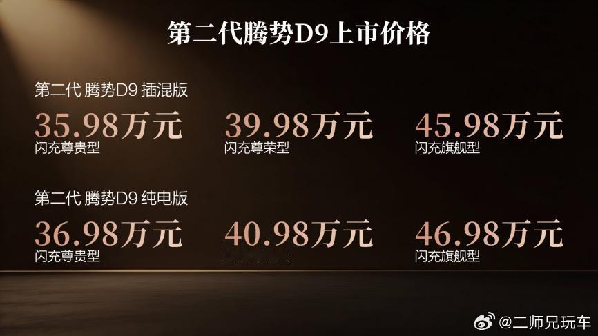 在国内高端新能源MPV市场,腾势D9无论是市场销量还是口碑反响,都相当不错。近日,第二代D9上市,35.98万至46.98万元的定价区间与此前基本持平,我觉得这是一次目标明确的“补强式换代”。首先值得关注的是,第二代D9全系标配第二代刀片电池及闪充技术,插混版CLTC纯电续航做到401km,这意味着日常通勤、接送孩子、周末近郊出游基本可以全程纯电覆盖。同时纯电版续航提升至800km,配合“5分钟充好、9分钟充饱”的闪充速度和年底即将建成20000座的闪充网络,新车型的补能体验正在向油车看齐。底盘方面,第二代D9首搭双阀云辇-C智能阻尼控制系统,双阀独立控制配合路面预瞄2.0,在“刹车不点头、起步不抬头、过弯不侧倾、过坎不颠簸”这四个维度上做了针对性优化。同步加入的定眩智能防晕车系统已通过专业机构认证,对于容易晕车的老人和儿童来说,这项配置的实用价值应该会超过纸面参数。在我看来,第二代D9是在续航、底盘、空间、智驾、安全、豪华感等每一个家庭用户关心的维度上持续做加法,直到“全能”本身成为最坚固的护城河。第二代腾势D9正式上市2026北京车展