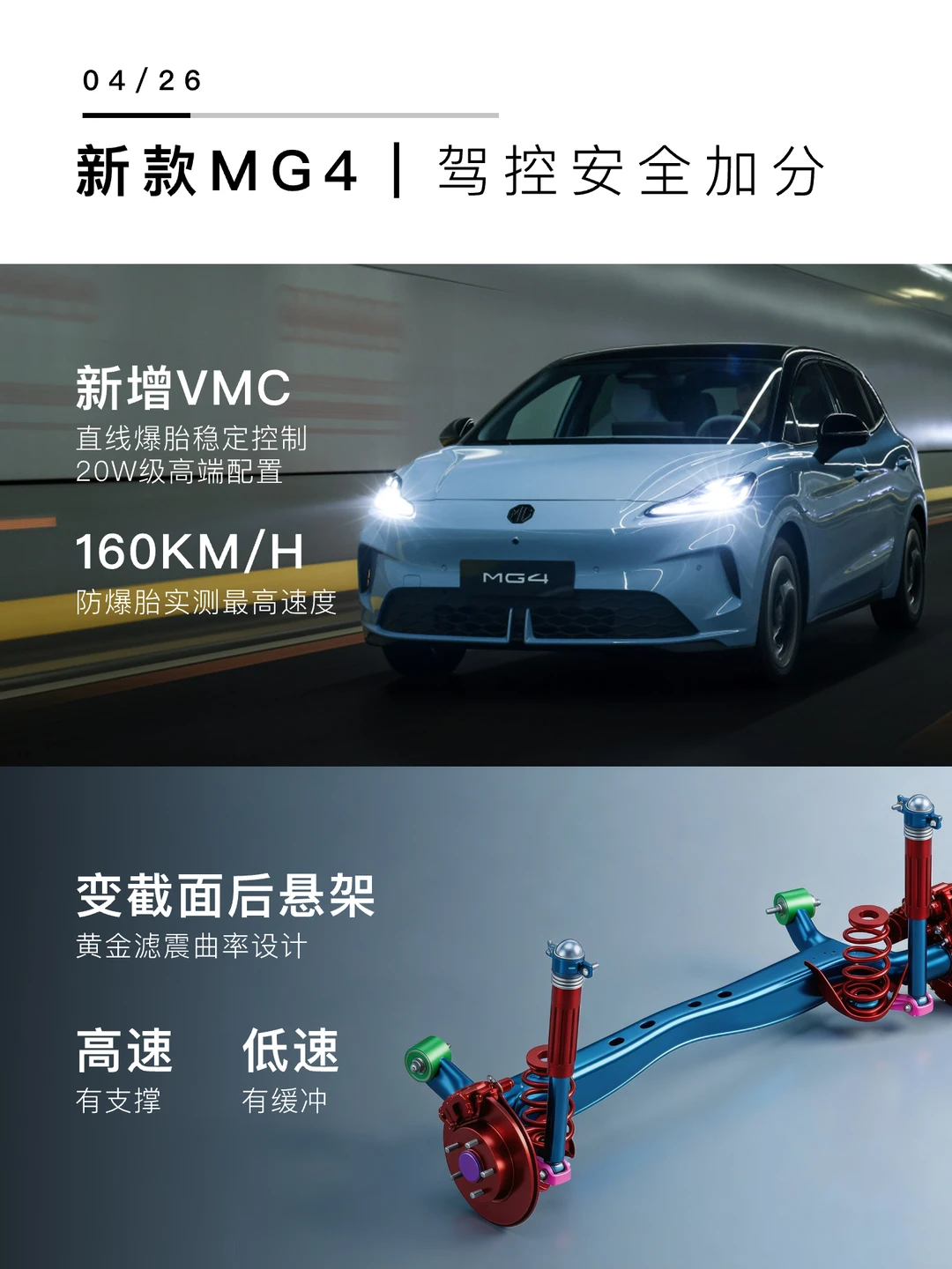 4️⃣安全的升级你可能看不到,但MG4还在坚持升级,新增VMC直线防爆胎这种20万级车才有的配置。