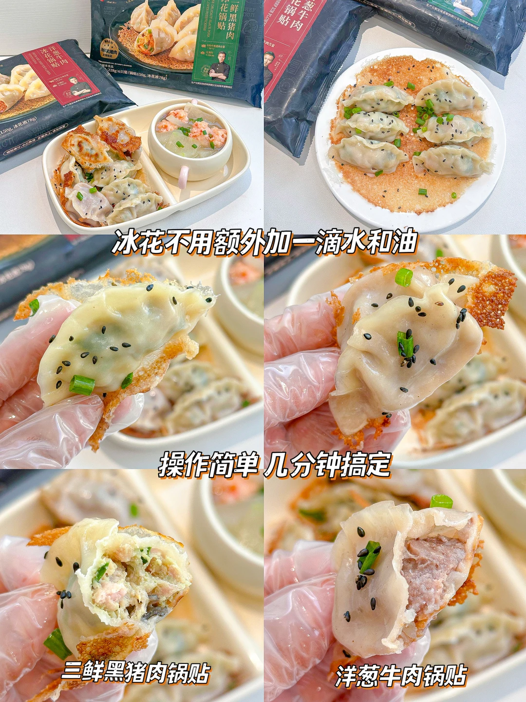 锅贴🥟是这次的新品,有洋葱牛肉和三鲜黑猪肉两种口味,配料表很干净,是家里厨房平时都会用到的,一个个皮薄馅大,整体含馅量≥68%,肉质精选安格斯牛上脑🥩和2小时直达工厂的冷鲜黑猪肉🐷制作起来很简单,摆放好锅中不用额外放一滴油和水,调味简单,非遗传承人技艺制作,手工包制,口感超地道,早上几分钟就做好了,一口爆汁,真的香迷糊了~