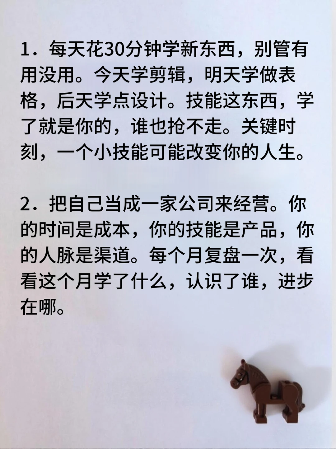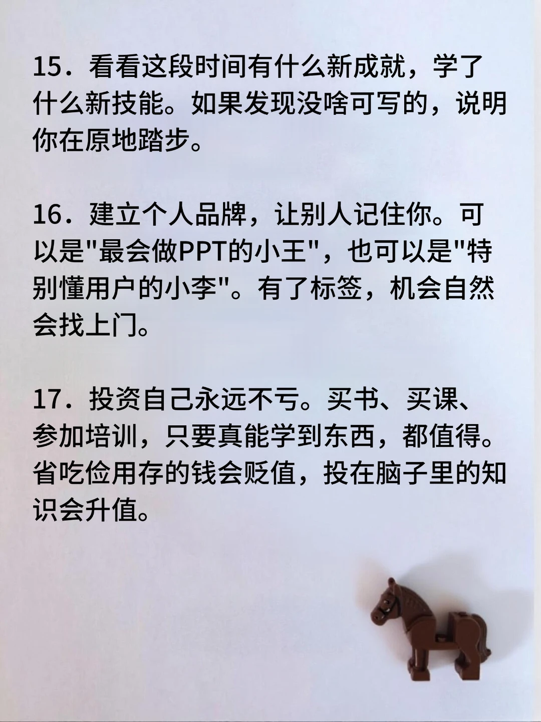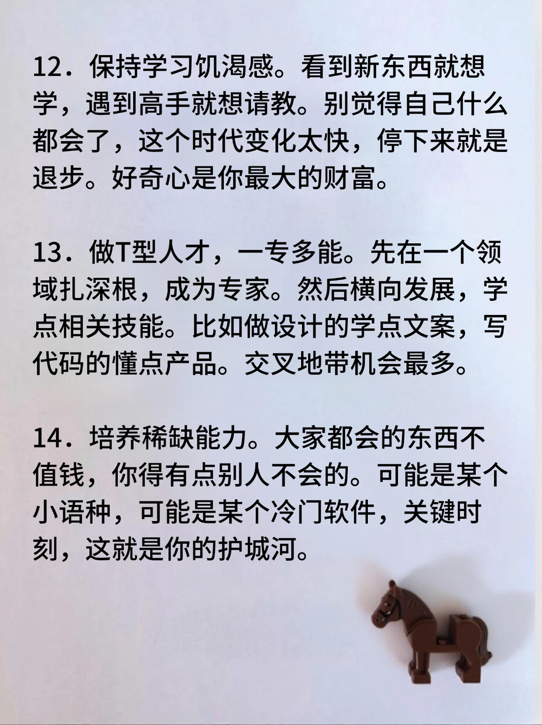 12.保持学习饥渴感。看到新东西就想学,遇到高手就想请教。别觉得自己什么都会了,这个时代变化太快,停下来就是退步。好奇心是你最大的财富。