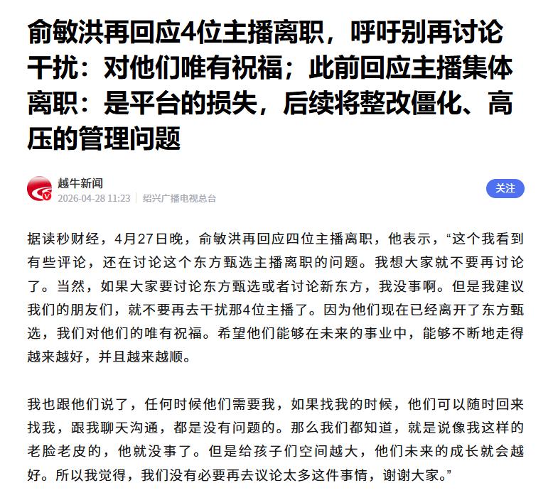 据媒体报道,针对此前东方甄选主播的集体离职事件,4月27日,俞敏洪再次做出了回应。