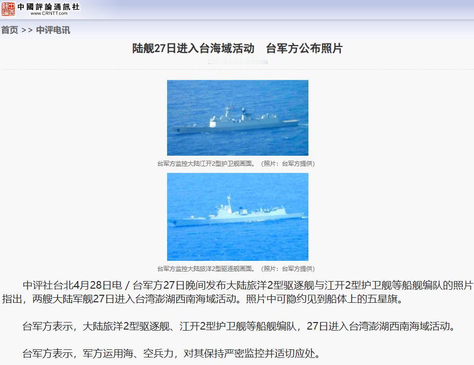 4月28日,根据中评社的报道,台军方发布了大陆旅洋2型驱逐舰与江开2型护卫舰等船舰编队的照片,两艘大陆军舰进入台湾澎湖西南海域活动。