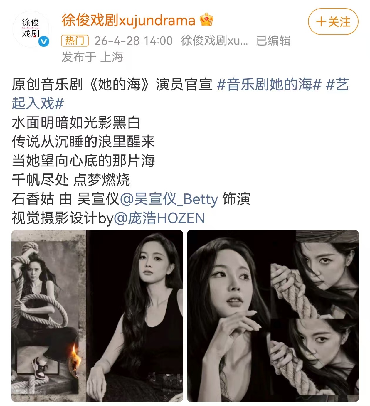 吴宣仪她的海官宣吴宣仪转型音乐剧了从唱跳爱豆到音乐剧演员,吴宣仪的每一步都走得坚定又耀眼。官宣《她的海》饰演石香姑,期待她在剧场里,为我们带来一场乘风破浪的视听盛宴!