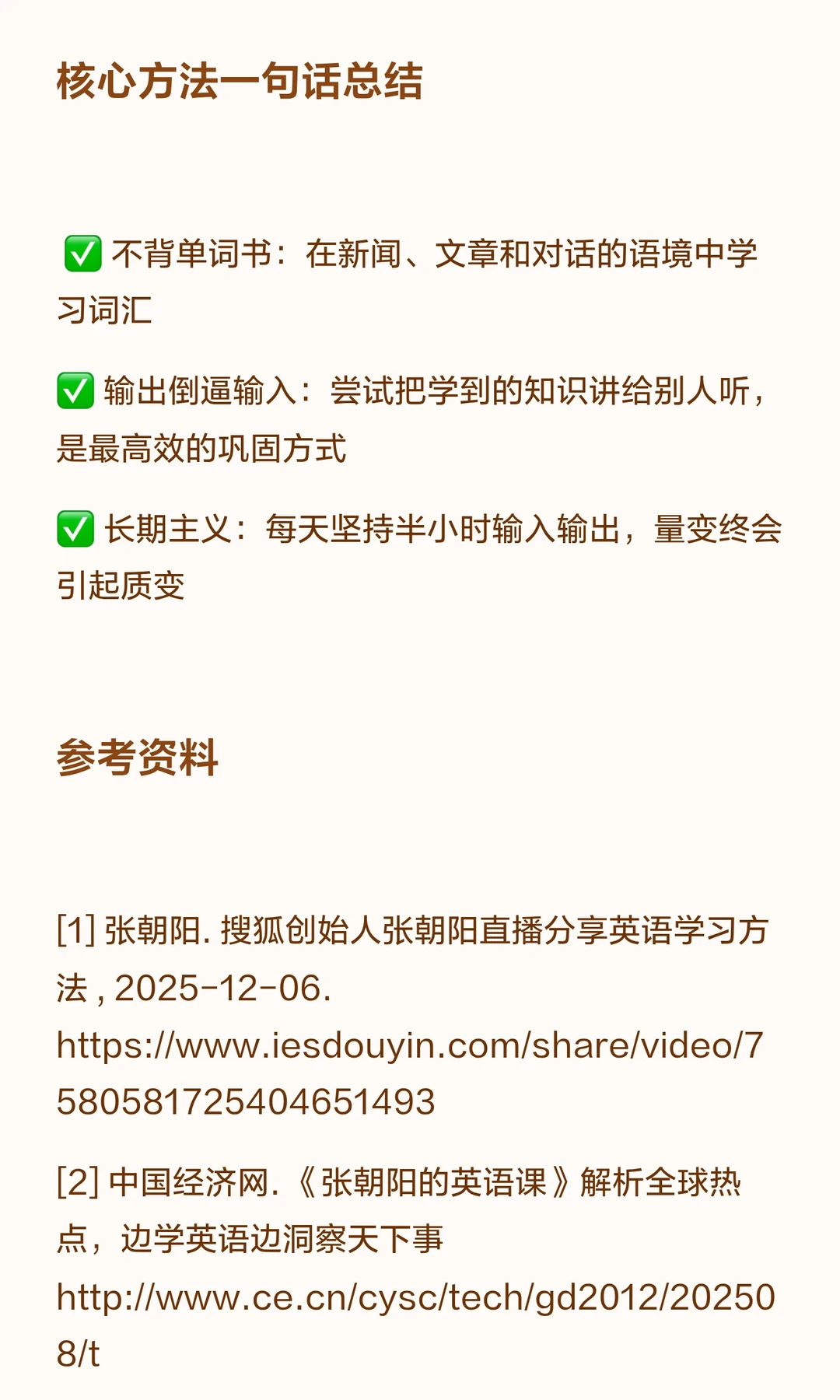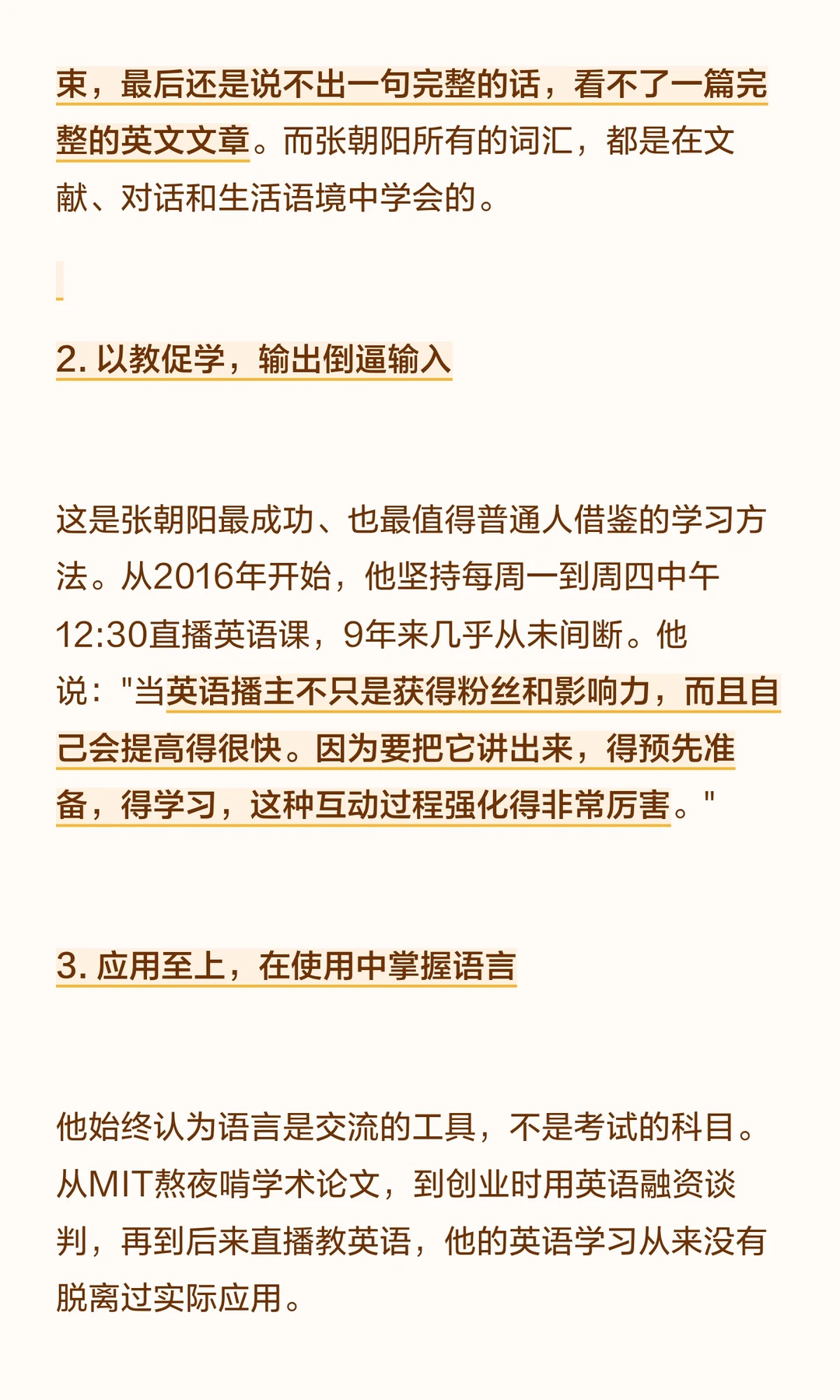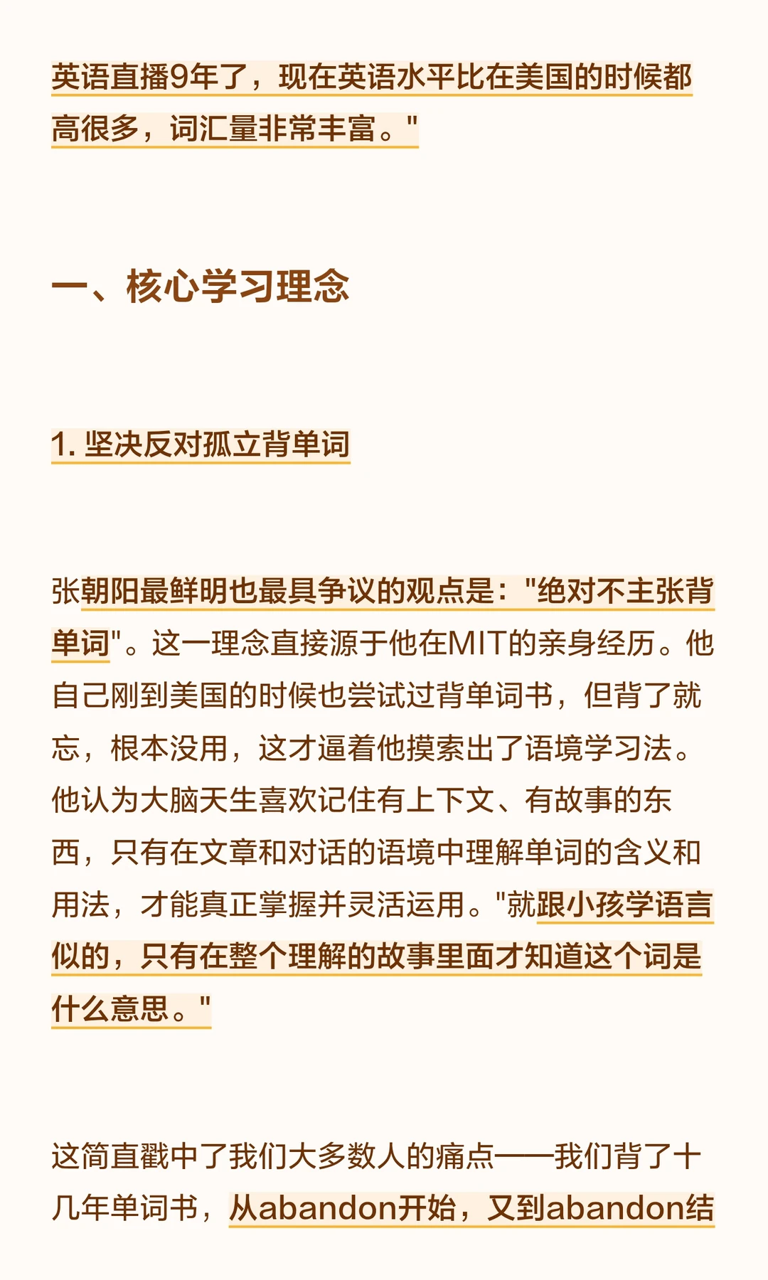 这简直戳中了我们大多数人的痛点——我们背了十几年单词书,从abandon开始,又到abandon结束,最后还是说不出一句完整的话,看不了一篇完整的英文文章。而张朝阳所有的词汇,都是在文献、对话和生活语境中学会的。