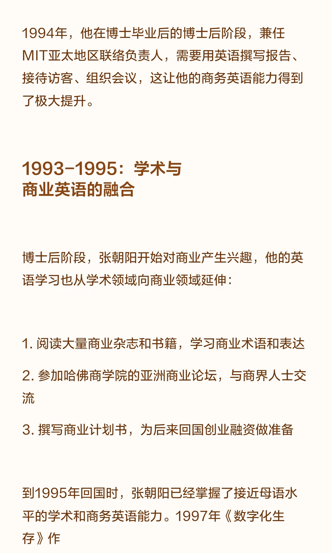 张朝阳的英语学习经历堪称当代成年人语言学习的范本。他不仅在麻省理工学院用7年时间完成了从"课堂失语"到"学术母语级"的蜕变,更在回国创业20多年后,通过"以教促学"的独特方式,让自己的英语水平实现了二次飞跃。他曾公开表示:"我的英语直播9年了,现在英语水平比在美国的时候都高很多,词汇量非常丰富。"