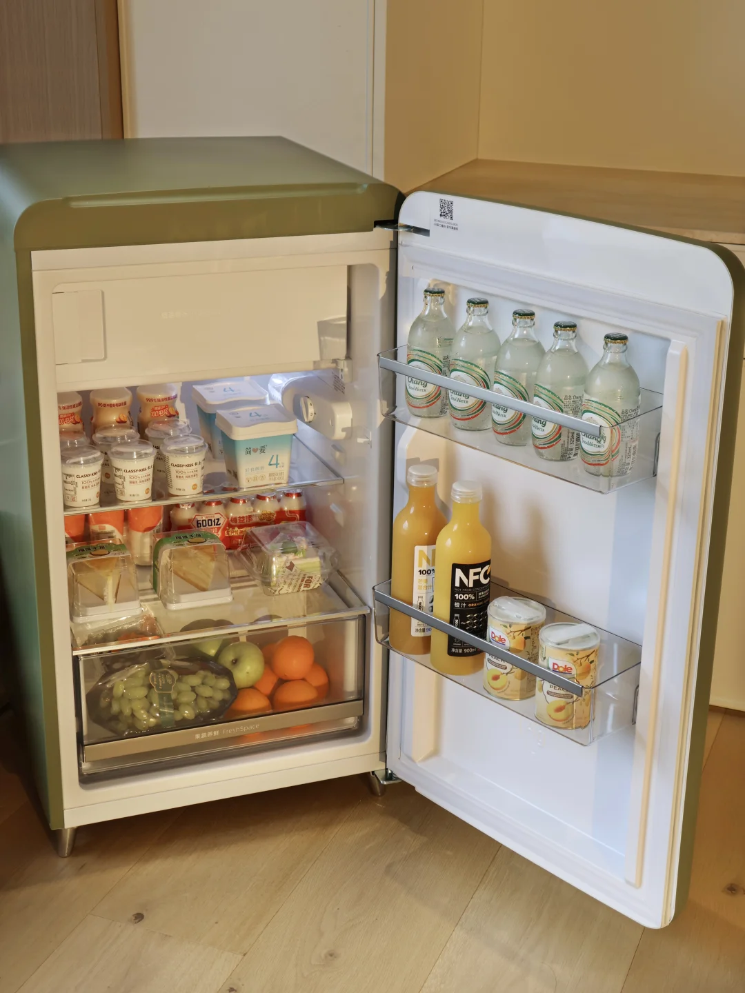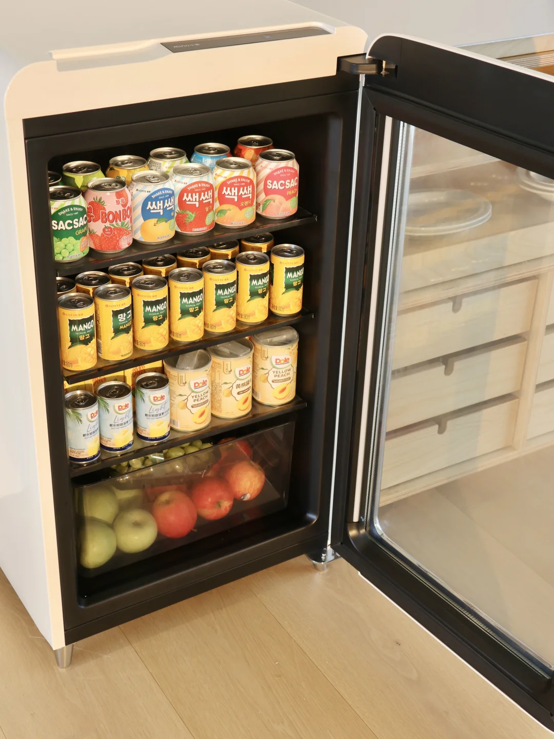 复古的外观配上这奶呼呼的白色,比纯白更温柔,和我家风格真的很搭。玻璃门清清透透,平时囤的饮料酒水、鲜切水果都放在里面,一眼就能看清,拿取超方便。走近自动亮起灯光,运行安静不打扰,完全不影响休闲时光。
