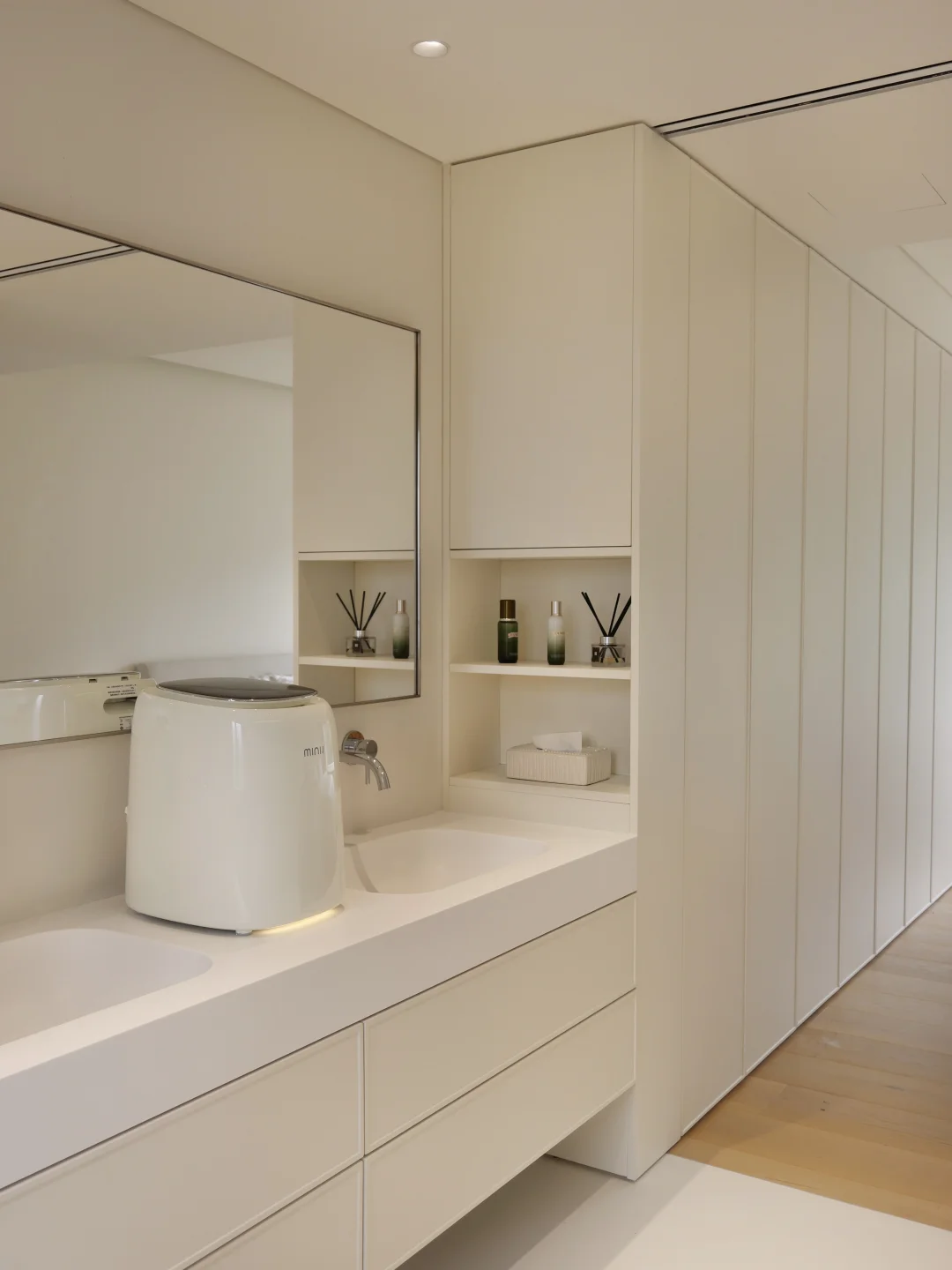 最贴心的还是主卧卫生间,放了台小吉内衣洗衣机,和客厅冰吧同色系,主卧视觉更统一。
