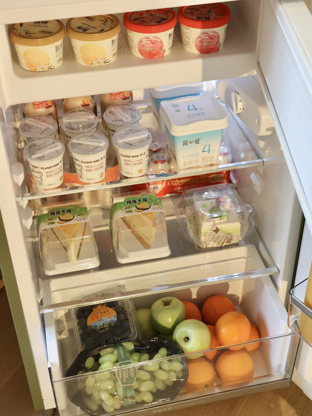 小小的体积还是冷冻冷藏一体的,上层冷冻是摆满了夏天的雪糕,下层塞满了宝宝的辅食、果泥