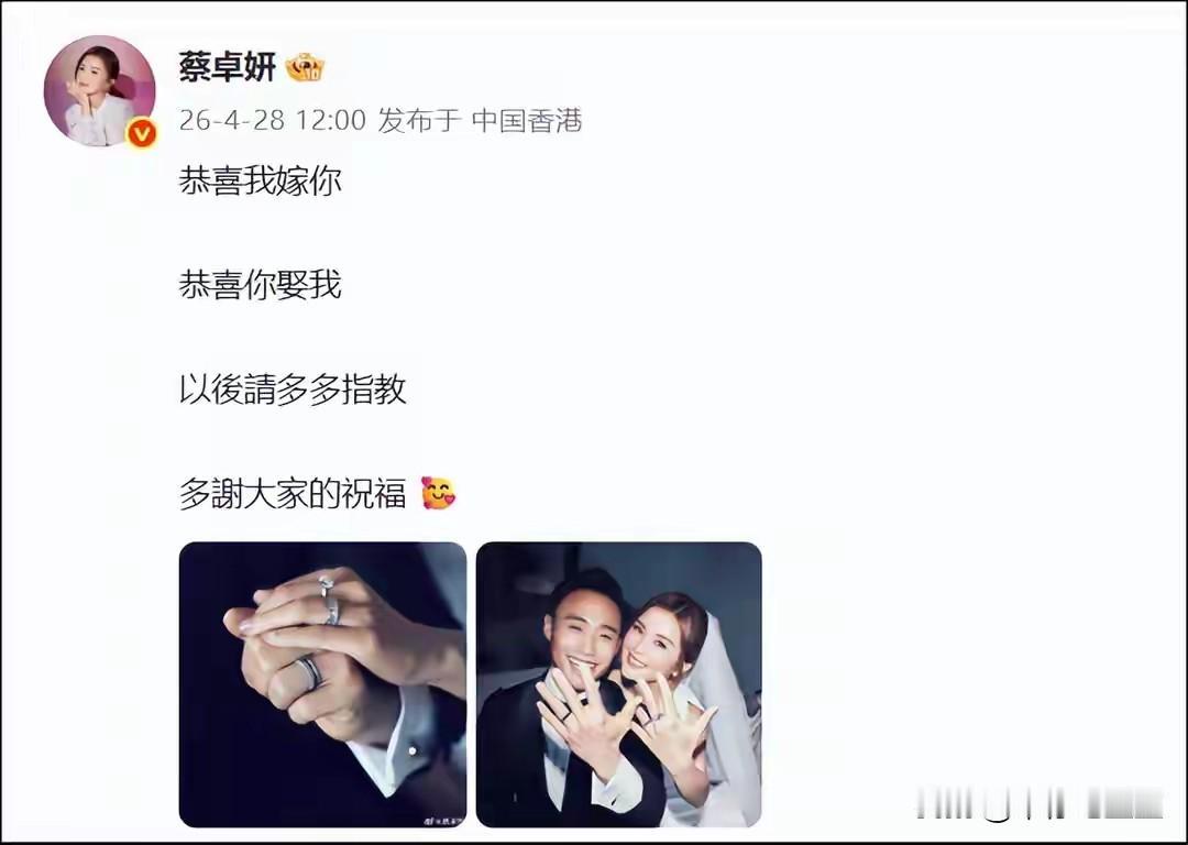 蔡卓妍宣布又结婚了!