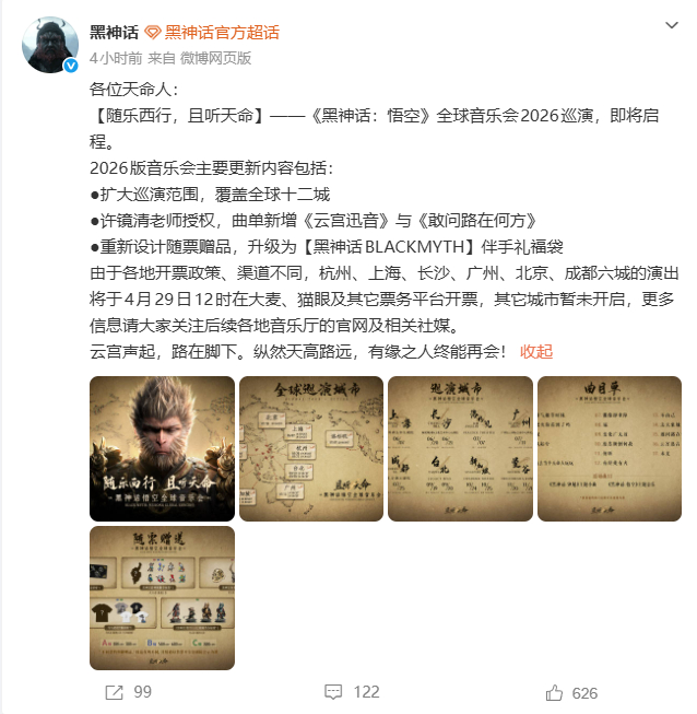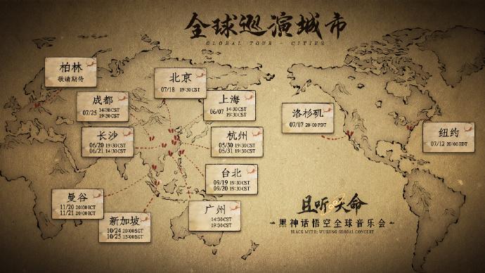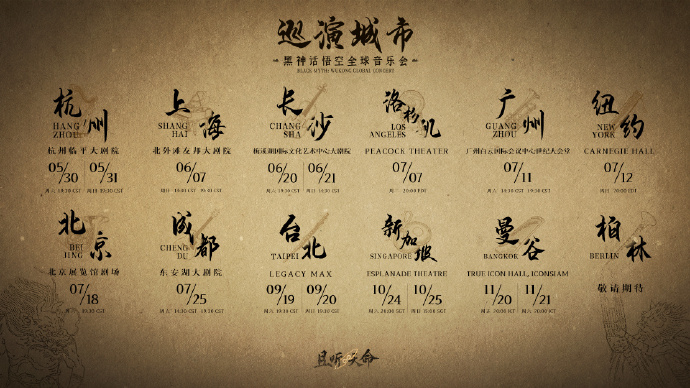 黑神话悟空全球音乐会 《黑神话:悟空》将于今年启动“随乐西行,且听天命”全球音乐会巡演,覆盖全球十二座城市。