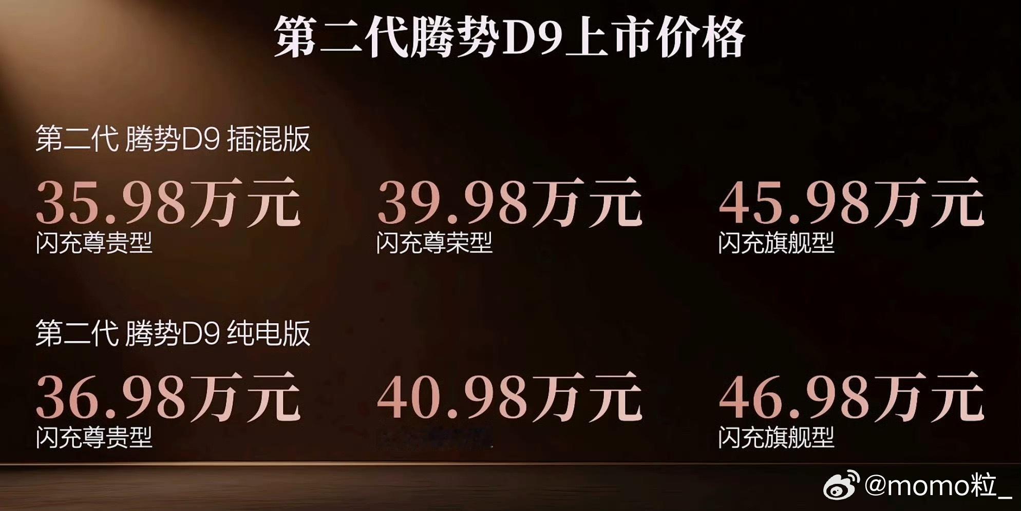 新款腾势D9价格出炉!增程35.98万起、纯电36.98万起,诚意拉满 外观内饰焕新,智驾与安全配置全面升级。核心搭载二代刀片电池+二代闪充,插混纯电续航401km、纯电版高达800km,长续航+闪充+闪充站形成完美闭环。合元超集成动力平台带来超大后备箱下沉空间,实力领先同级。豪华出行的新追求,腾势D9凭硬实力定义豪华MPV新标杆!