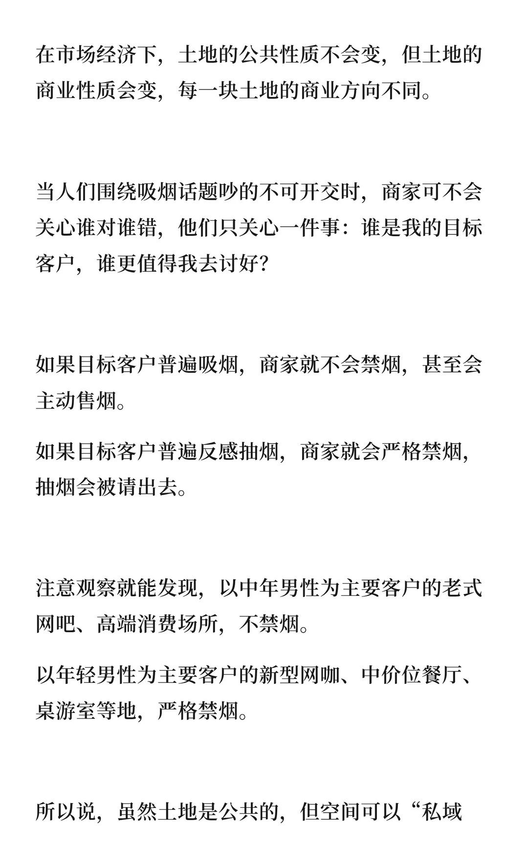 禁烟问题本质是公共空间分配,商家根据目标客户决定是否禁烟。