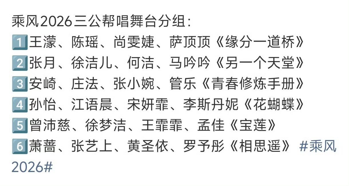 乘风2026三公帮唱舞台分组好期待尚雯婕萨顶顶帮帮唱的《缘分一道桥》啊!!!肯定是顶级视觉听觉享受!!!燥候!!乘风2026