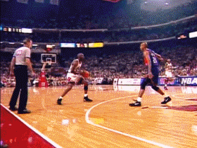 乔丹因为有逆天的滞空及超强身体对抗能力,他的拉杆躲闪幅度大,能在空中应变自如,整个过程非常流畅,观赏效果极佳,最关键的是乔丹拉杆之后基本不会摔倒,更不会摊手向裁判要犯规!