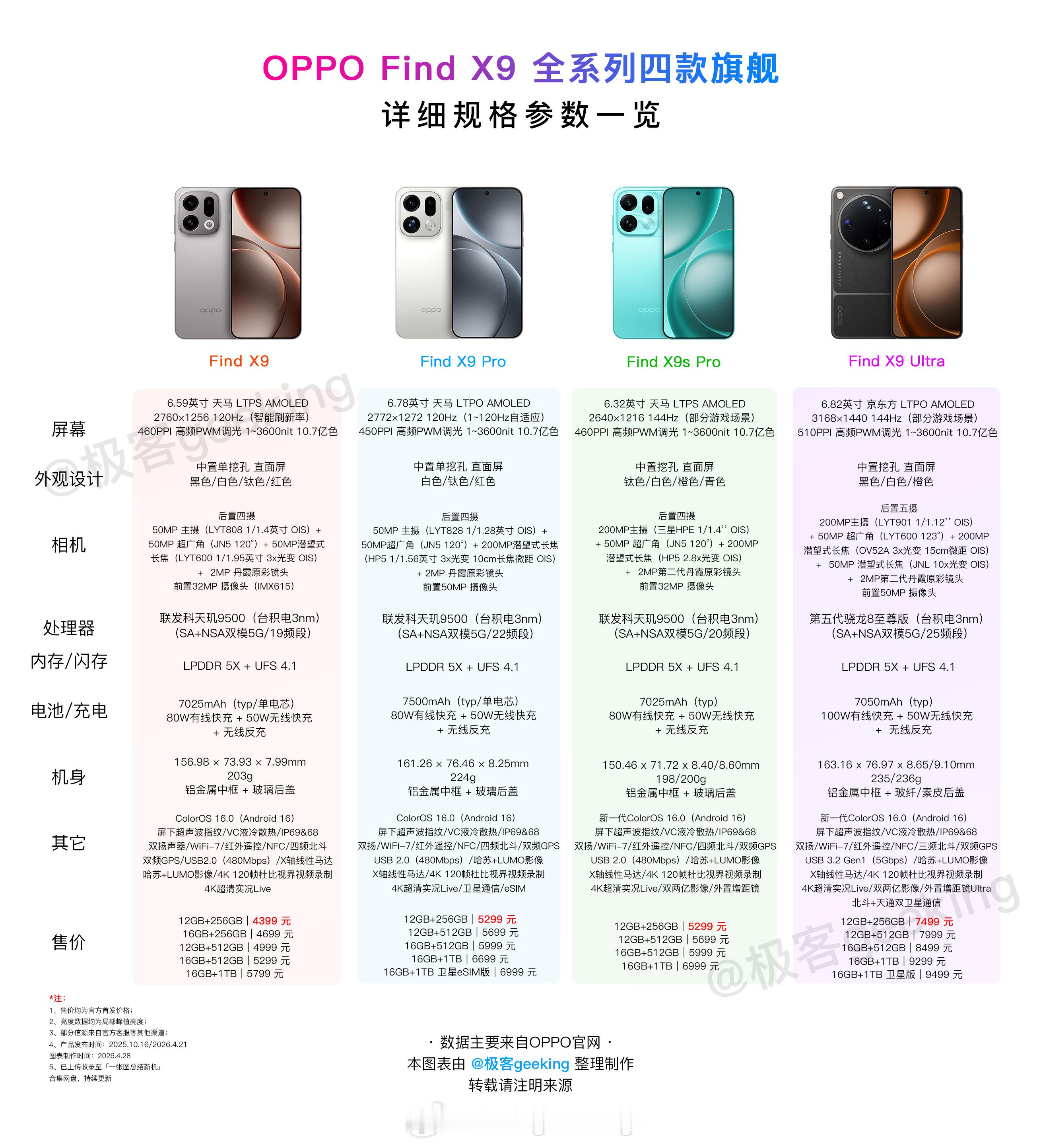 关于 OPPO Find X9 全系列这四款旗舰手机的外观、详细配置参数和售价尽在这张「手机参数对比图」里了,图表持续维护和更新。最后制图不易,求点赞关注多多支持~