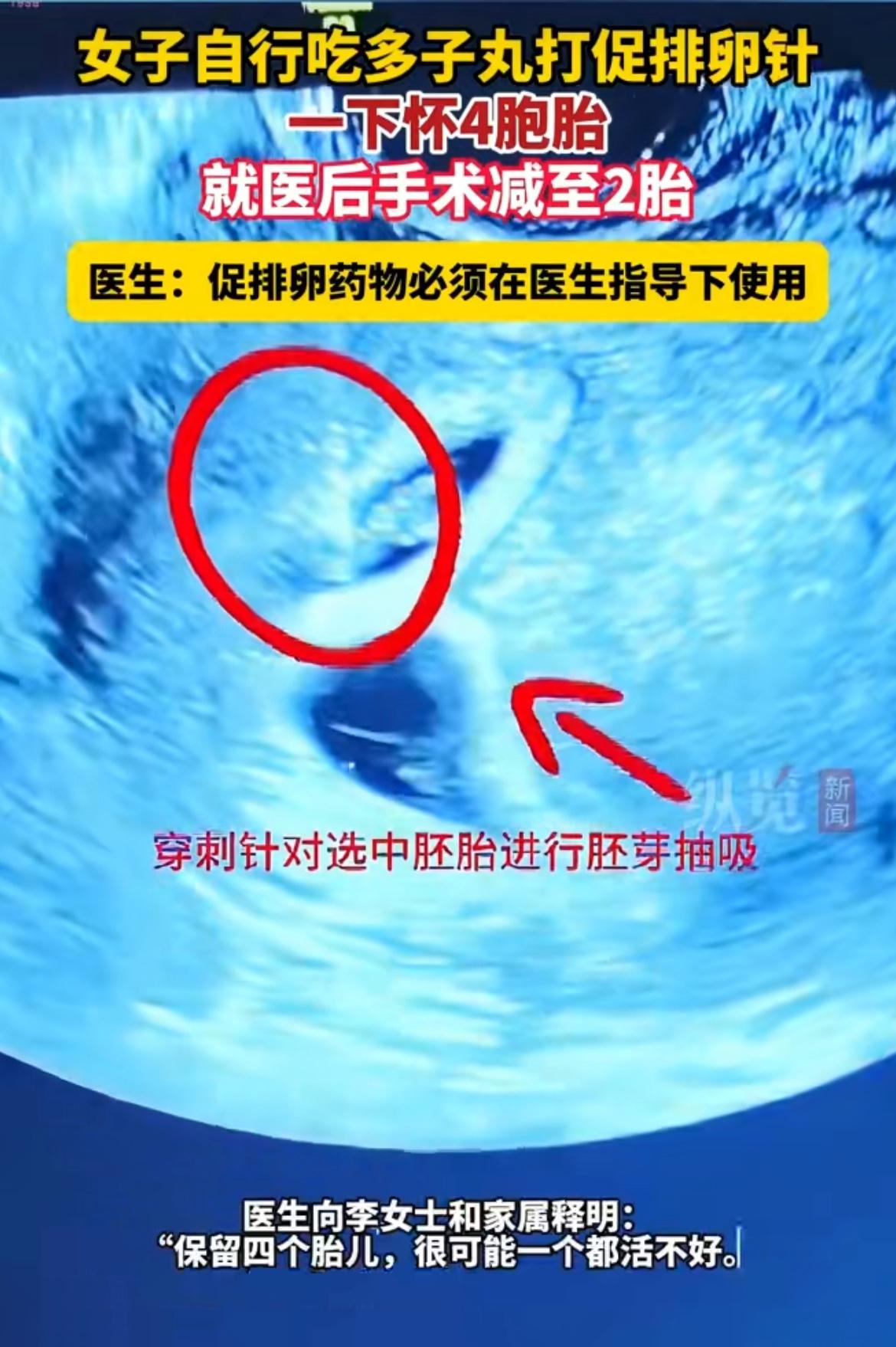 江苏淮安的李女士之前备孕一直不太顺利,着急之下就自己去药店买了俗称“多子丸”的促排卵药物服用,还自行注射了促排卵针,没想到用药之后真的成功怀孕,可早期产检结果出来,李女士怀的居然是四胞胎。