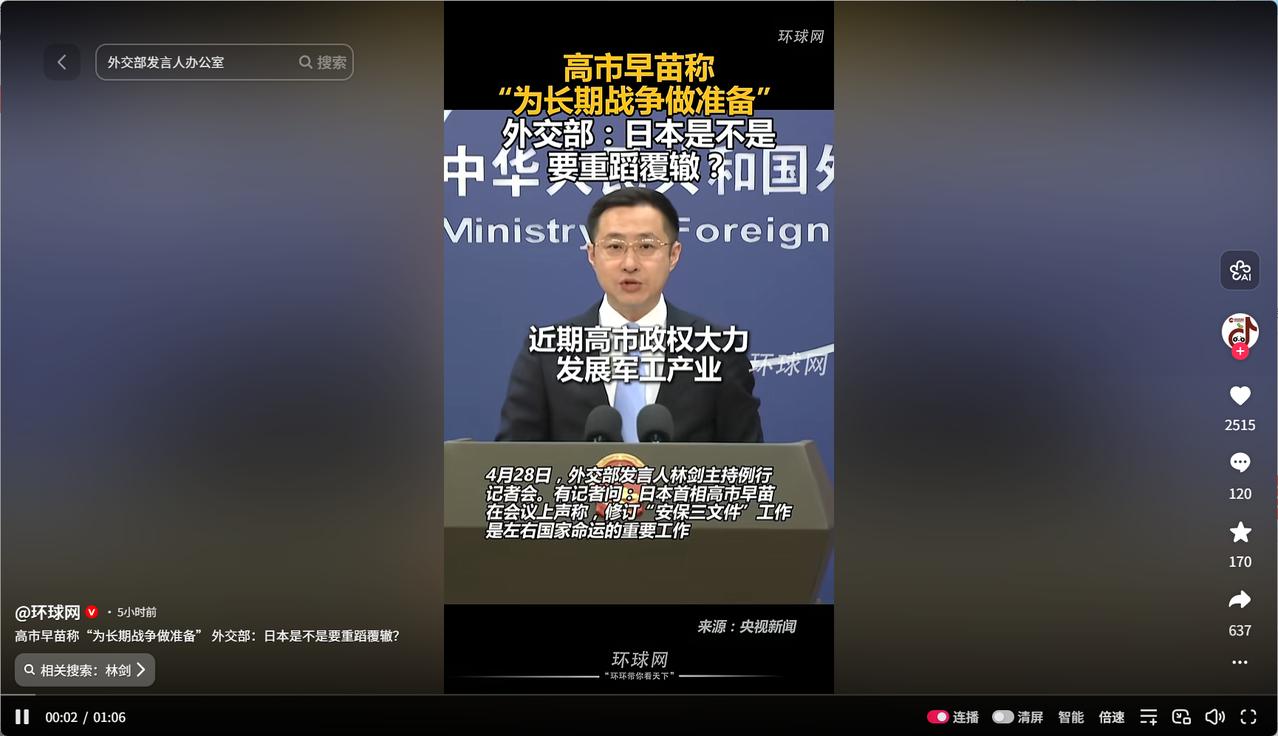 4月28日,日本首相高市早苗在政府会议上声称,要以俄乌及中东局势为教训,推进应对“新型作战方式”并为长期战争做好准备,外交部发言人林剑随即发出严正警告:日本是不是要重蹈历史覆辙?