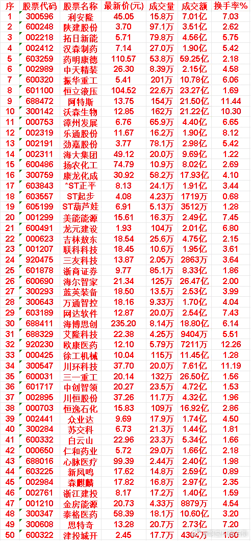 利安隆:最新价 45.05 元,成交量 15.8 万手,成交额 7.01 亿元陕建股份:最新价 3.70 元,成交量 97.1 万手,成交额 3.51 亿元拓日新能:最新价 5.71 元,成交量 79.8 万手,成交额 4.56 亿元汉森制药:最新价 7.14 元,成交量 27.0 万手,成交额 1.90 亿元药明康德:最新价 110.57 元,成交量 53.8 万手,成交额 59.25 亿元中天精装:最新价 26.30 元,成交量 8.39 万手,成交额 2.15 亿元