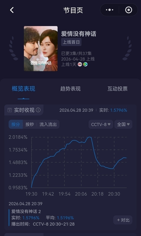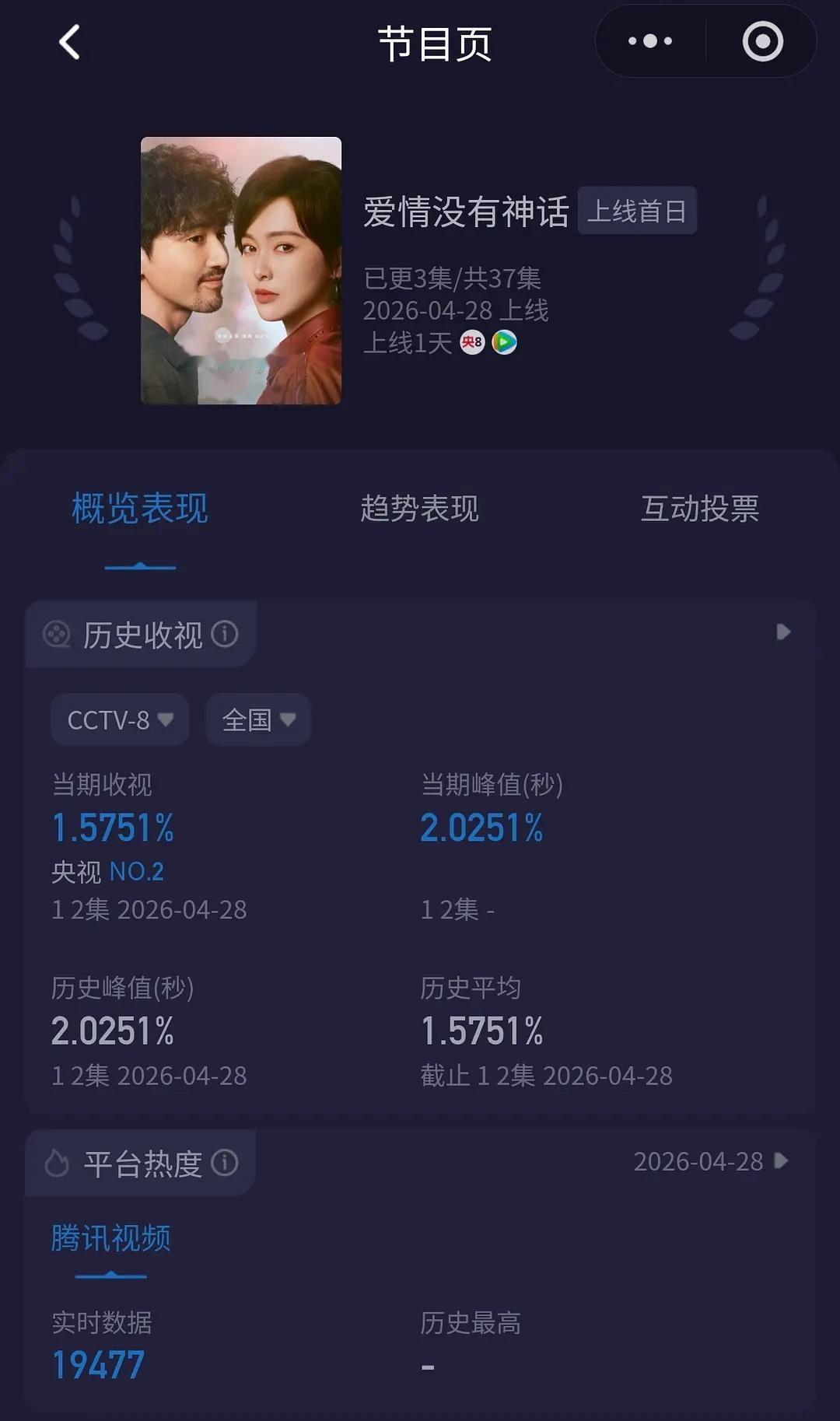 爱情没有神话首日热度不破2万酷云1.5,尤其第二集走势很差,扑街是95%了等过阵子老树再上剧挽尊,大家手拉手