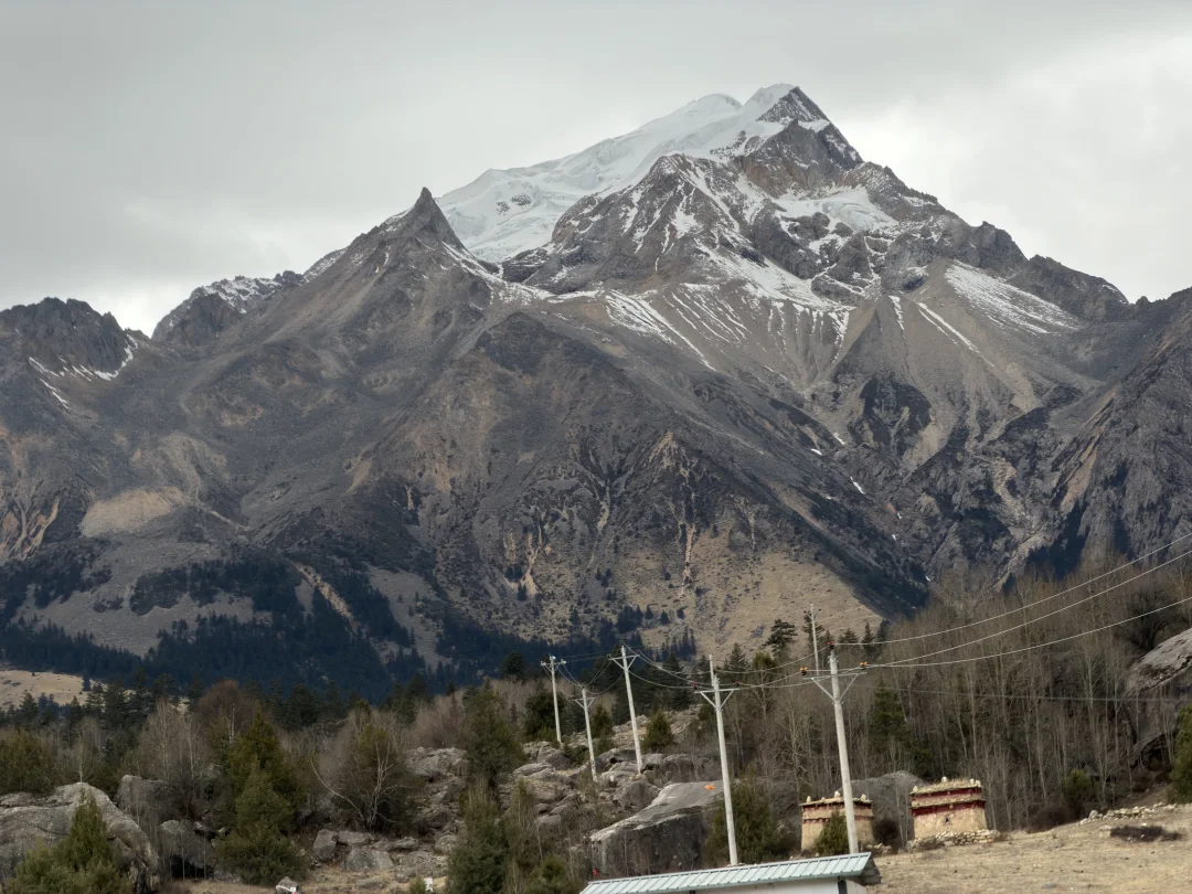 初进神山,天空就飘雪了,给了我们下马威。路很好走,都是柏油路,只是翻山越岭,弯道很多,考验车技。忘记了过了多少弯道,翻过了几座山,只记得有一瞬间,转过一弯,格聂神山完全显露在我眼前,那种震撼无以言表,清秀、威严,确实漂亮
