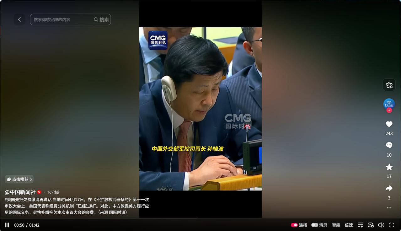孙晓波指出,把拖欠会费作为调整会费的施压手段是不可取的,中国始终按时足额缴纳条约审议大会以及相关会议的费用,中方敦促美方履行应尽的国际义务,尽快补缴拖欠本次审议大会的会费。