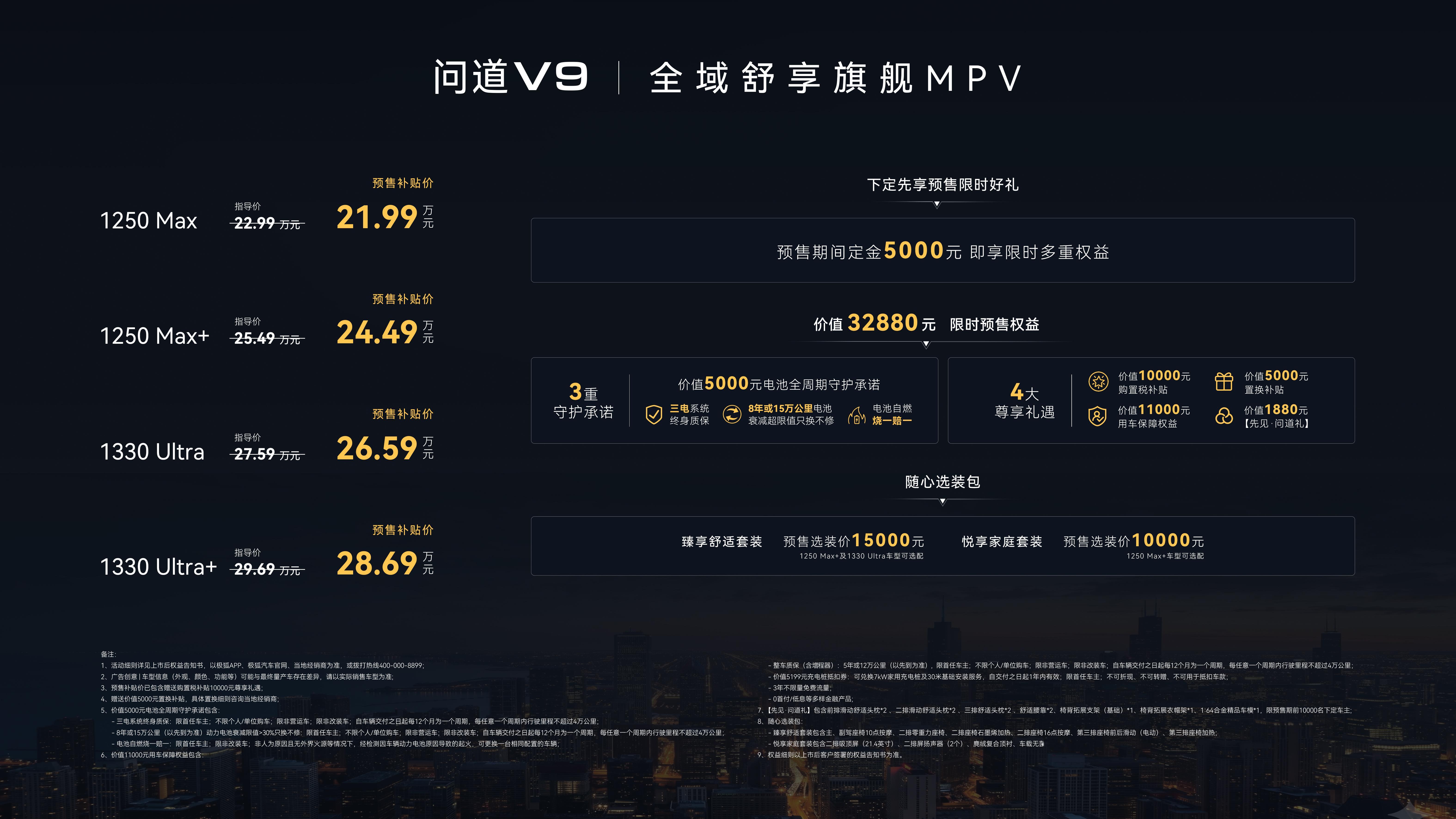 【预售补贴价21.99万起 极狐问道V9开启预售】4月28日,极狐问道V9正式开启预售,预售期间推出4款车型,预售补贴价为21.99万-28.69万元。外观上,新车采用ARC-FLOW极智源流设计哲学,上窄下宽车身兼具大气质感与空气动力学优势,前脸配备立体化星芒直瀑式格栅,搭配贯穿式脉冲光语大灯,辨识度较高。车身尺寸方面,其长宽高分别为5300/1980/1850mm、轴距3200mm,同时配备智驾状态指示灯,并提供9种外观颜色可供选择。内饰简约大气,以大尺寸悬浮屏为核心,大量软性材质包裹搭配256色氛围灯,有3种内饰配色。空间上,采用2+2+3七座布局,得房率达77%,其中第二排独立零重力航空座椅功能齐全,同时配备吸顶屏、小桌板和冷暖冰箱。智能化方面,新车搭载哈曼Ready Display 15.6英寸中控屏和高通骁龙8775芯片,支持6音区AI语音交互,全球首发国家大剧院声学座舱及22扬声器音响系统。动力方面,新车搭载华为雪鸮智能静音增程系统,全系标配宁德时代电池,纯电续航可达216km-310km,综合续航为1250km-1330km,且支持闪速补能。值得一提的是,新车还搭载元境系统,可支持全场景NOA领航和自动泊车功能。大v聊车