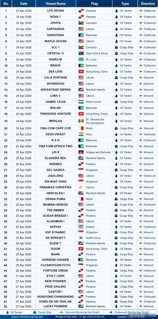 阿联酋退出石油输出国组织 过去 72 小时内共有 30 艘船只途经霍尔木兹海峡,其中包含 6 艘油轮与 5 艘伊朗货船;与此同时,至少 52 艘船只(31 艘油轮及约 21 艘货船)已驶过美方划定的所谓封锁线。