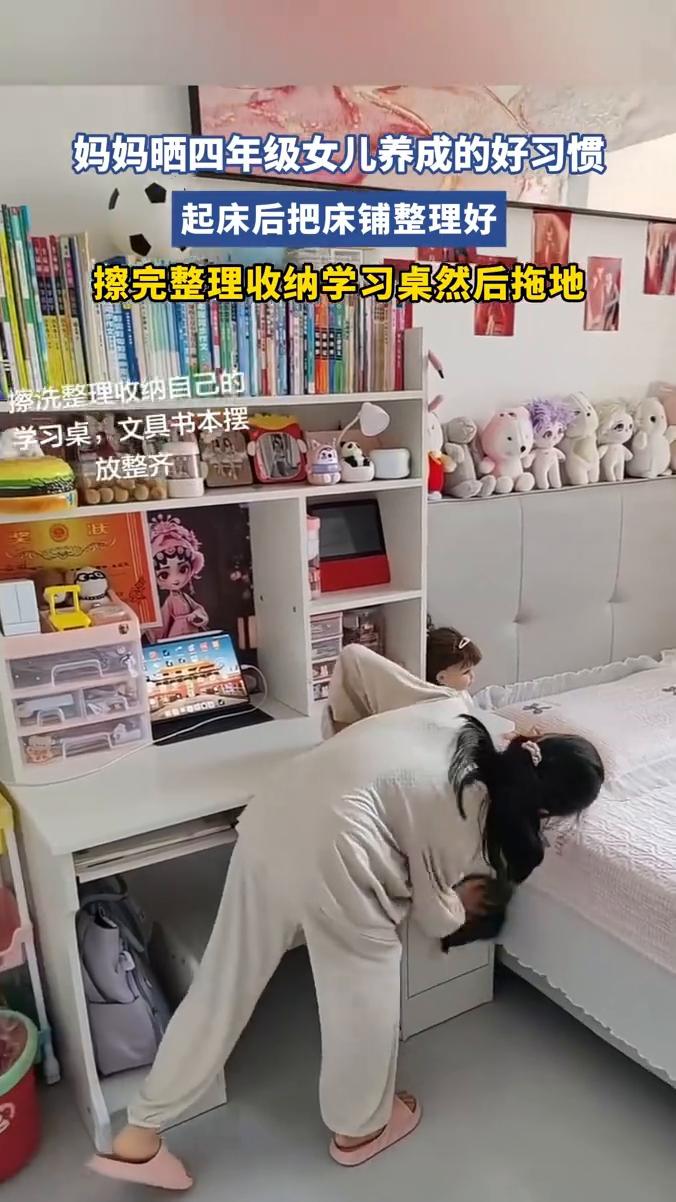 起床后把床铺整理好,擦完整理收纳学习桌然后拖地。起床后先把自己的床铺整理好,每天早起几分钟。擦洗整理收纳自己的学习桌、文具、书本摆好。最后把自己房间的地板拖一遍,每天必须要拖一遍地板,从小养成一个好习惯。来自四年级小朋友的房间,每天坚持自己整理收纳,每天保持干净整洁。