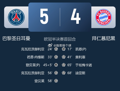 巴黎圣日耳曼5比4拜仁 又是一场经典战役,没有误判,没有恶意伤人,没有袒护判罚,