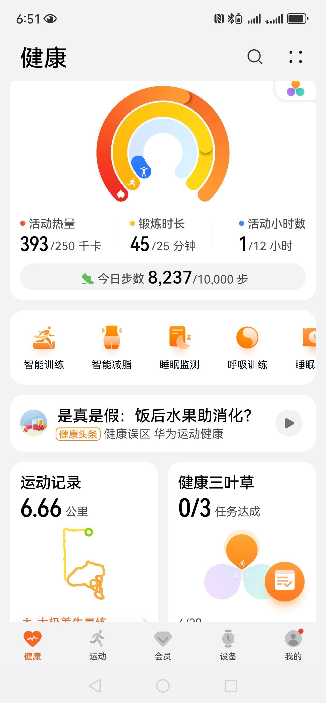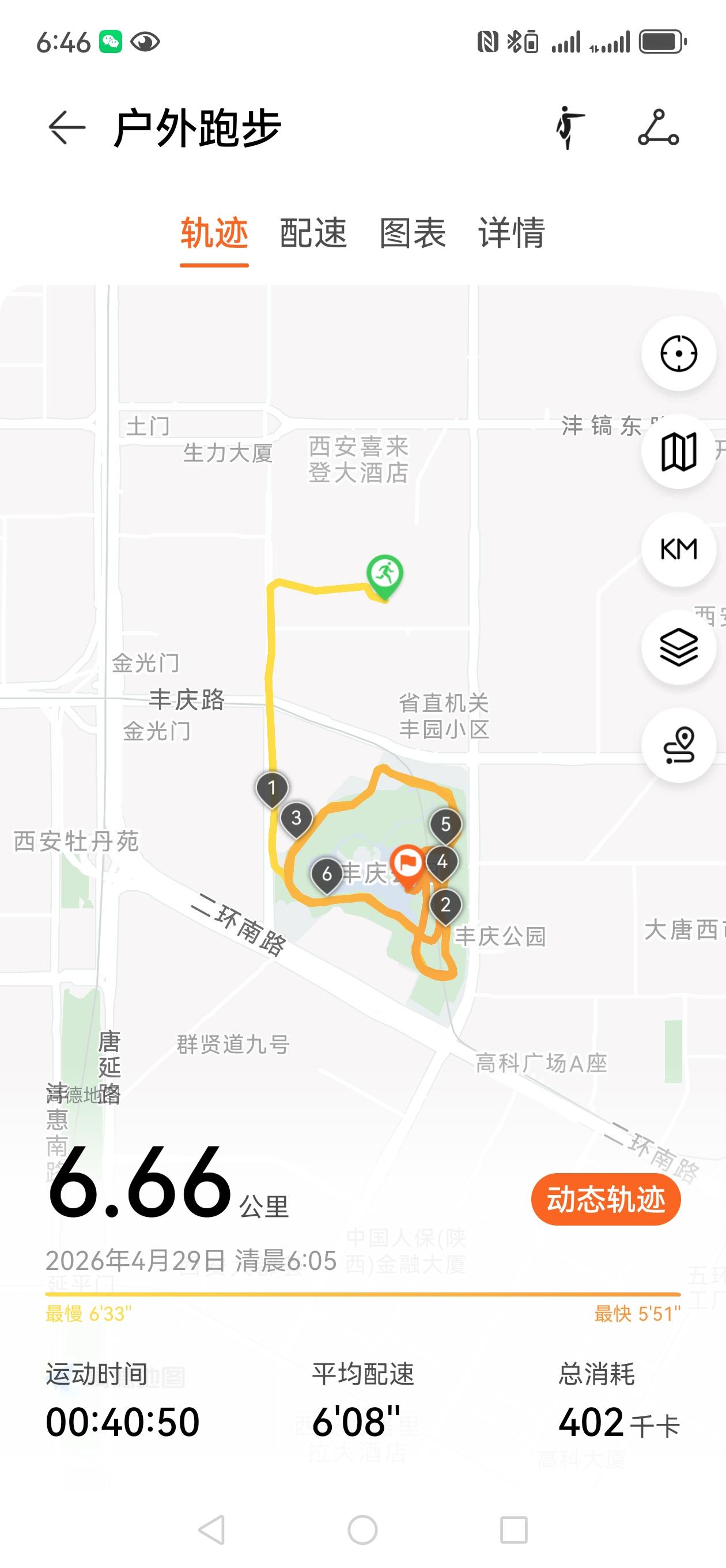 今日晨跑打卡,中慢跑6.66公里,用时40分50秒,消耗热量402千卡,微微出汗,爽歪歪。