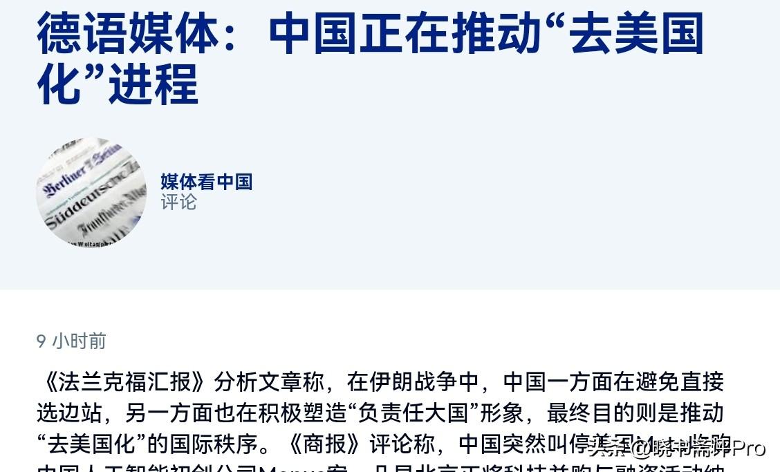 德媒表示,中国正在推动“去美国化”进程,中国绝对不可能军事帮助伊朗!4月29日,德国之声刊文表示,在伊朗战争中,中国一方面在避免直接选边站,另一方面也在积极塑造负责任大国形象,最终目的则是推动“去美国化”的国际秩序。尽管中国正在通过多方外交,展现中国的影响力,但是认为中国会军事帮助伊朗则几乎不可能。