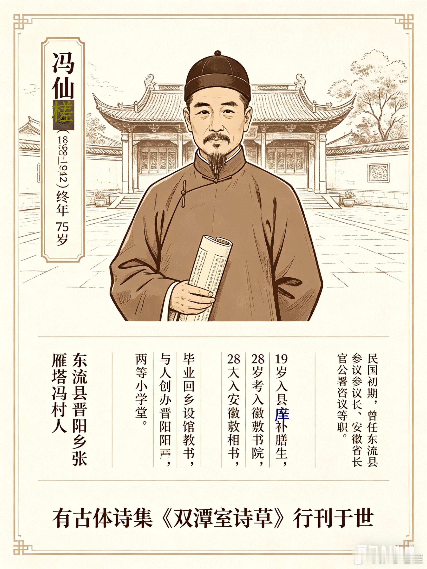 东流县政界、教育界名人冯仙槎(1868—1942);民国初年45-50岁;1927年59岁。终年75岁。说明:本文中的张溪地方历史人物铜雕像和图像由老屋张忠设计;AI制作;其中:图像和雕像下方及旁边,有个别文字模糊或错误亟待修订。冯仙槎,字定章,号凌汉,东流县晋阳乡(今张溪区雁塔冯村)人,生于 1868年(清同治七年),卒于1942年,终年75岁。冯仙槎 19 岁入县庠补膳生,后考入安徽敬敷书院,毕业即回乡里设馆教书,数十年孜孜不倦。东流县不少学子生员均受业于他。国民党中央执行委员陈访先,武汉大学教授,古生物学家章韫胎亦出自其门下。光绪 34 年与欧阳荣合作创办晋阳乡两等小学堂,并亲自任教。民国初期,曾任东流县参议会参议长、安徽省长官公署咨议等职。后退避林泉乡间,仍以教书为业。他不置田产,藏书成癖,并藉诗酒以自娱。有古近体诗集《双潭室诗草》行刊于世间。