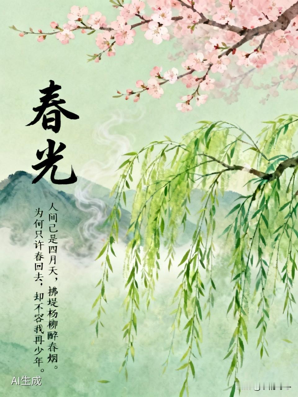 就像高鼎《村居》里“草长莺飞二月天,拂堤杨柳醉春烟”,都是写春天里杨柳的妙句。而《春光》后半句“为何只许春回去,却不容我再少年”更绝,把对时光流逝的感慨体现得淋漓尽致。春天年年都会回来,可青春一去不复返,让人读着就忍不住感叹。