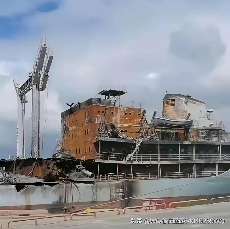 被YJ18击中后,这艘补给舰的甲板和船体严重变形。可见导弹的威力!