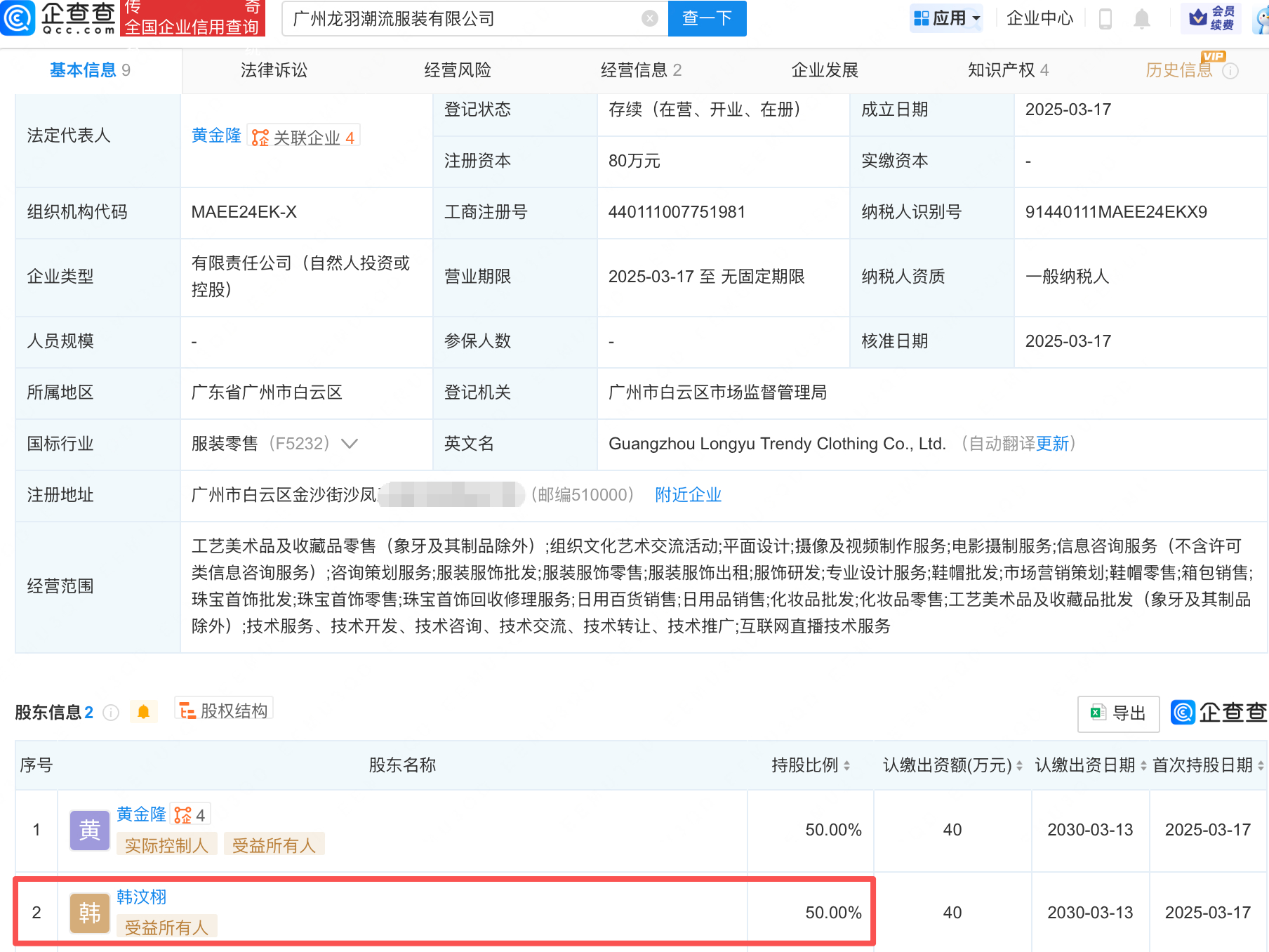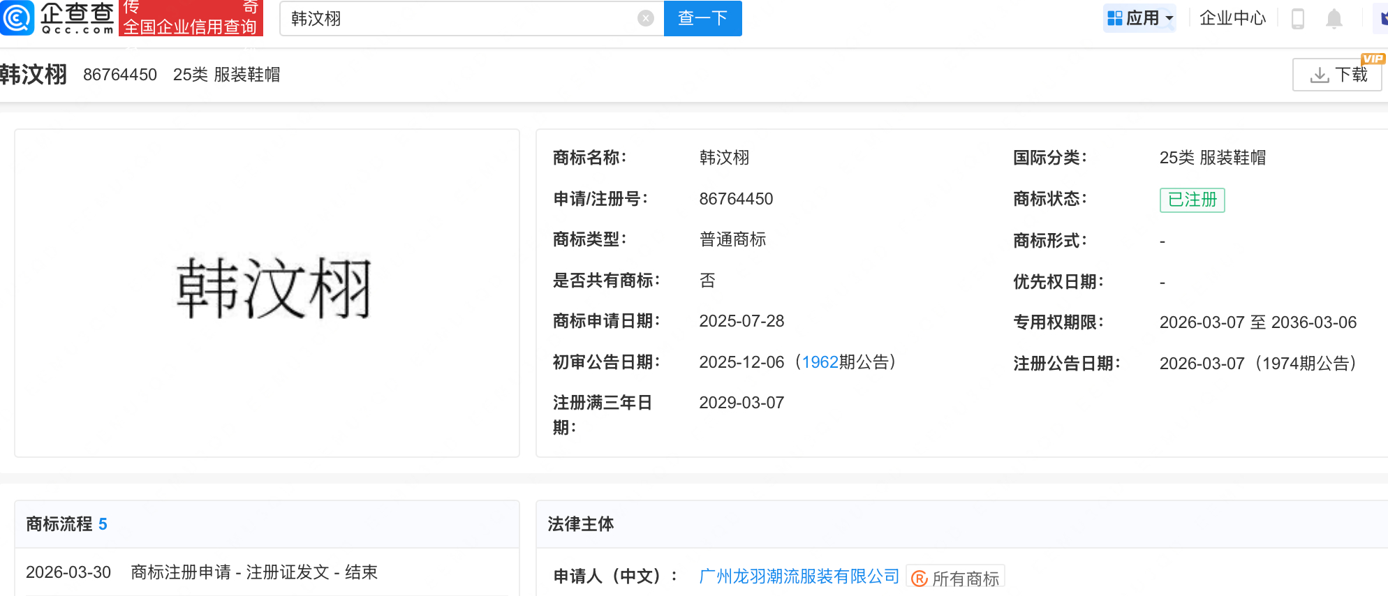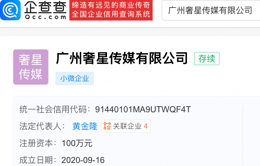 韩汶栩近30天掉粉19万【韩汶栩公司已注册其姓名商标】近日,网红主播韩汶栩官宣恋情后,因多名女性接连曝光与其存在情感纠葛,被网友戏称为“韩家大院”,引发讨论。韩汶栩韩家大院经查询,第三方平台信息显示,韩汶栩关联MCN为奢星传媒,其账号近30天已掉粉19万。据企查查APP显示,广州奢星传媒有限公司成立于2020年9月,法定代表人为黄金隆。信息显示,黄金隆另关联广州龙羽潮流服装有限公司,该公司成立于2025年3月,韩汶栩对其持股50%。目前,该公司已注册韩汶栩姓名商标,国际分类为服装鞋帽。