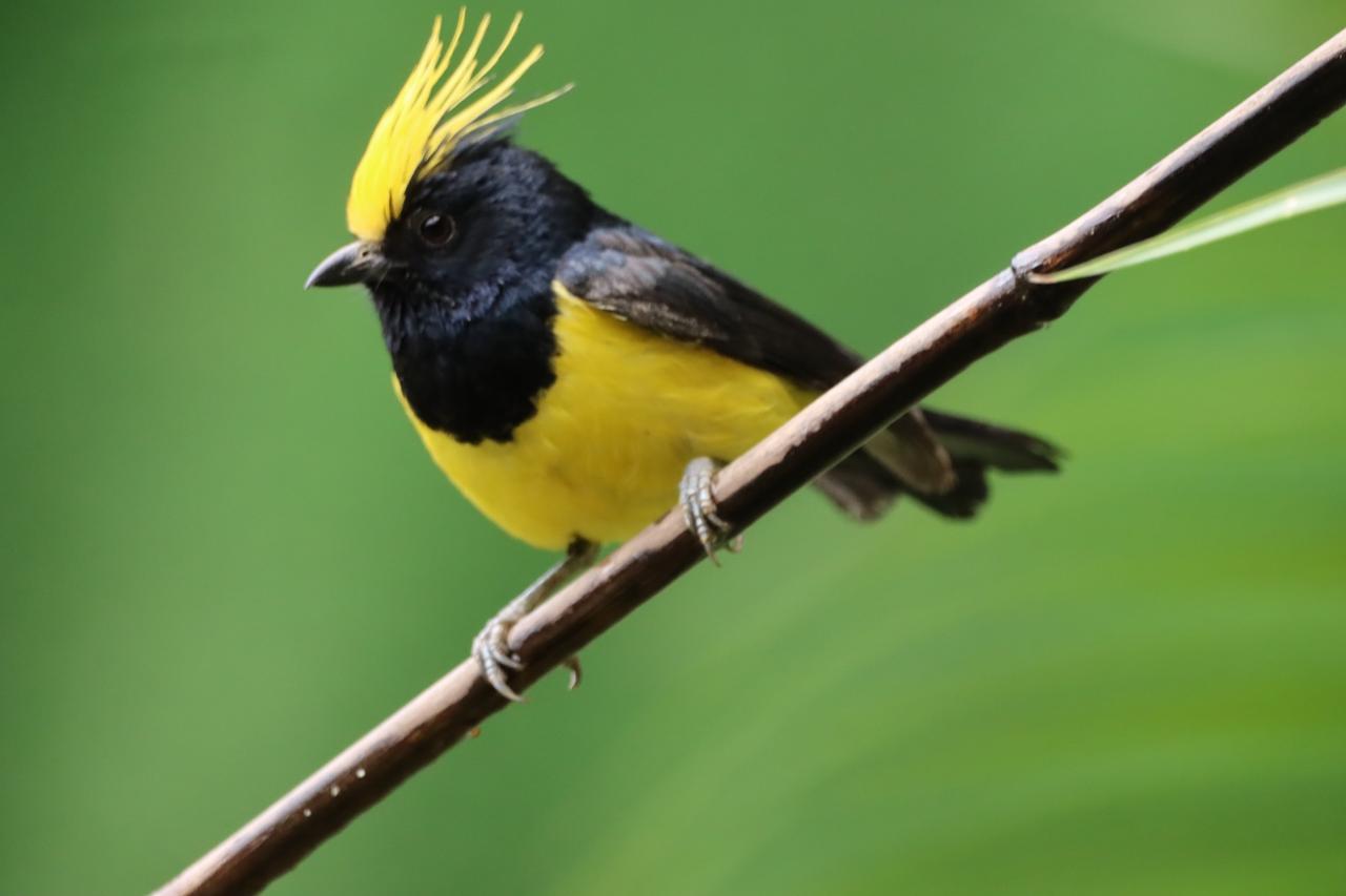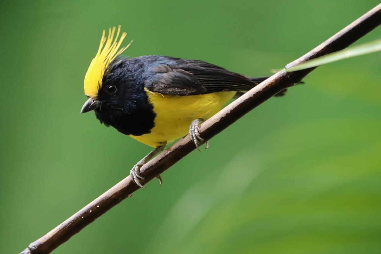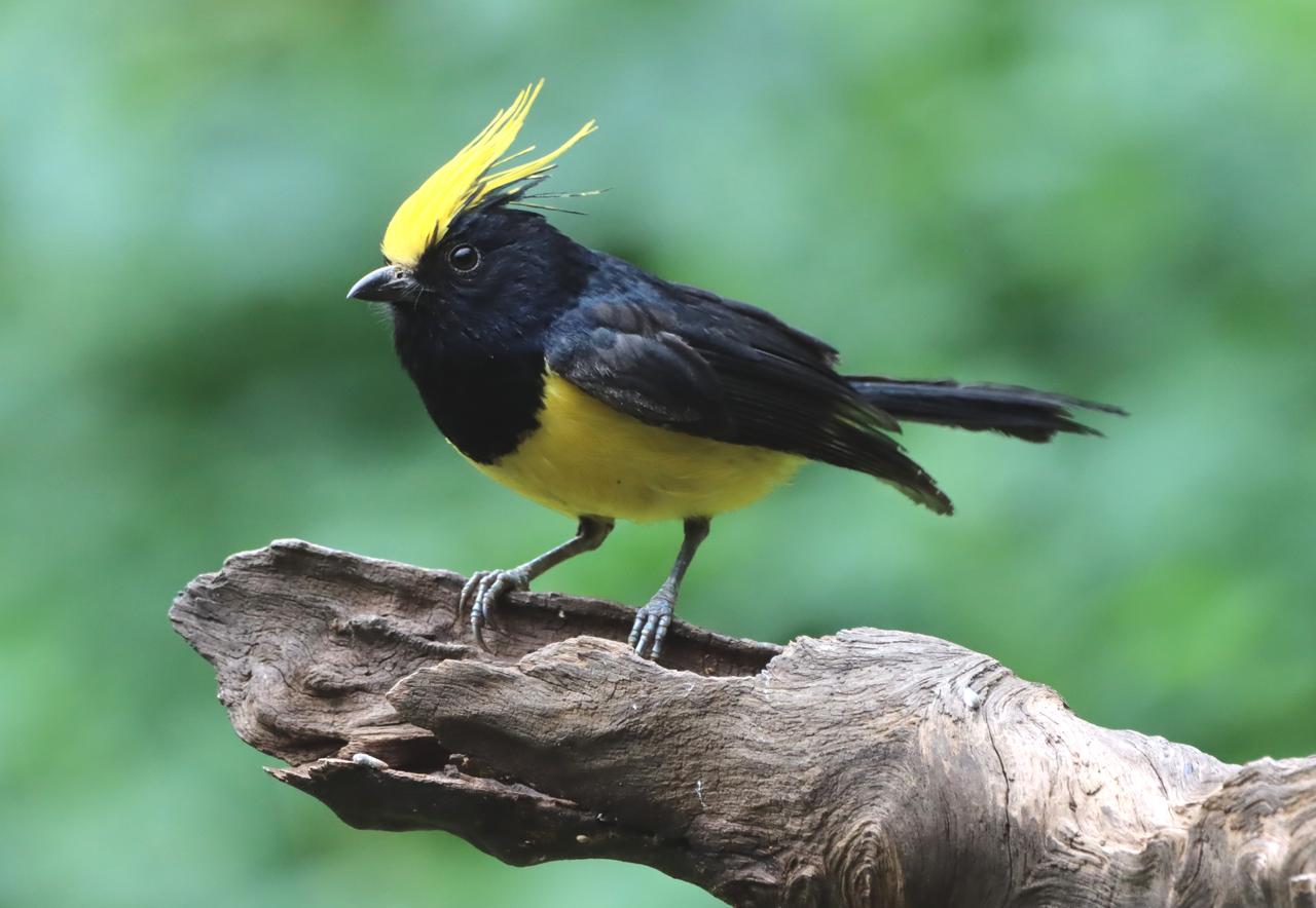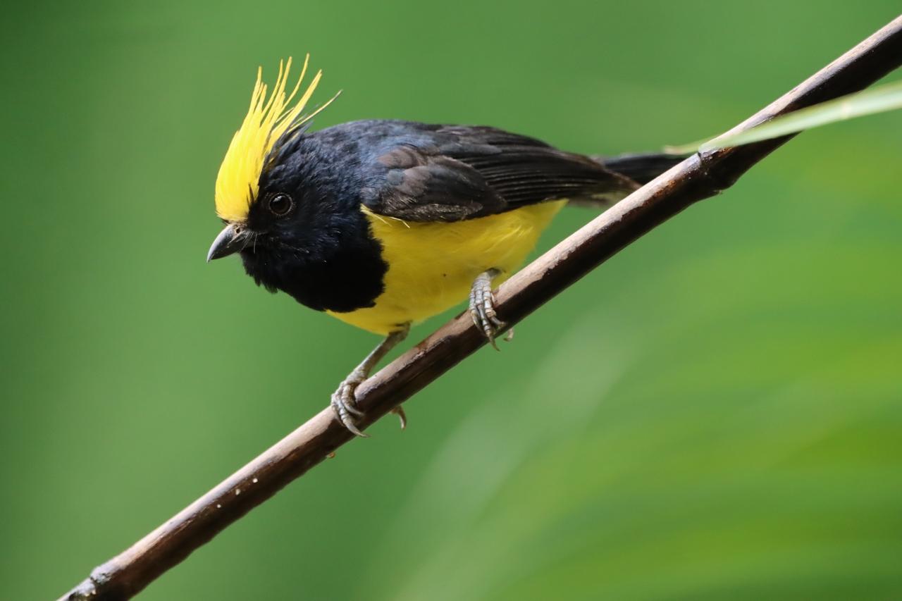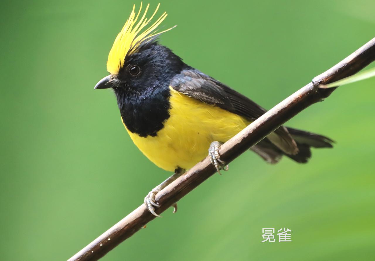 黑羽金冠鸟,栖息绿树间。