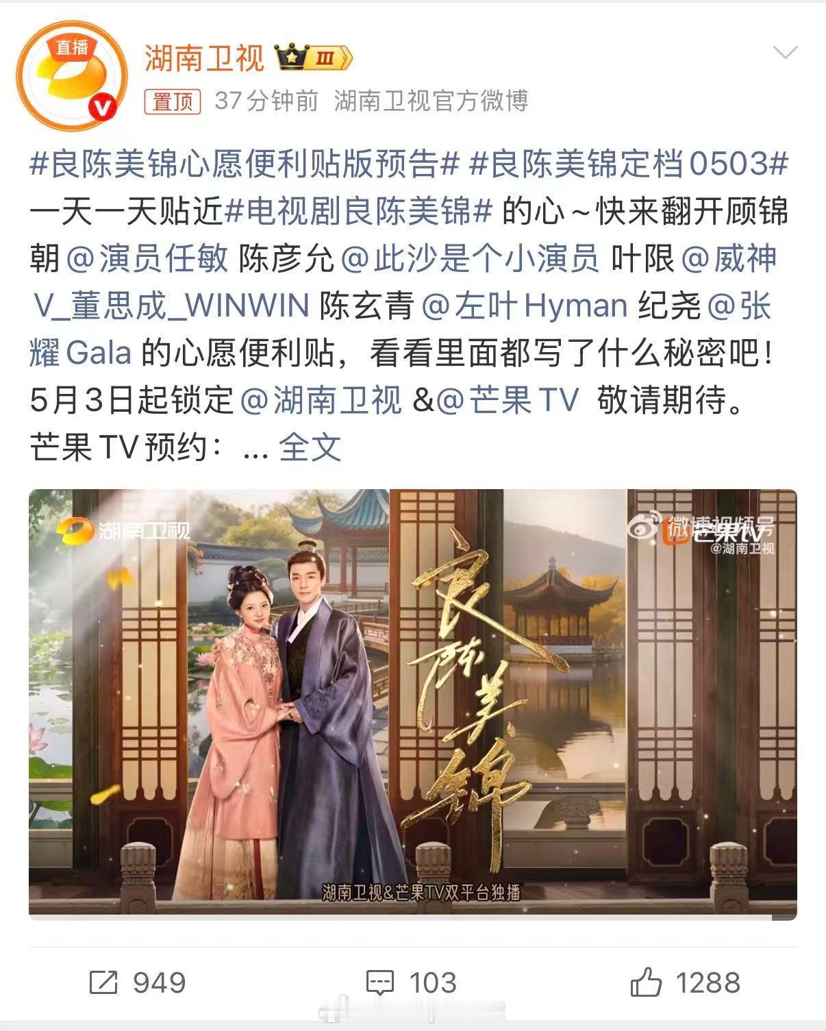 湖南卫视良陈美锦BGM用心愿便利贴良陈美锦心愿便利贴版预告 温柔甜美的BGM中和了古装的压抑感,整部剧都变温柔了