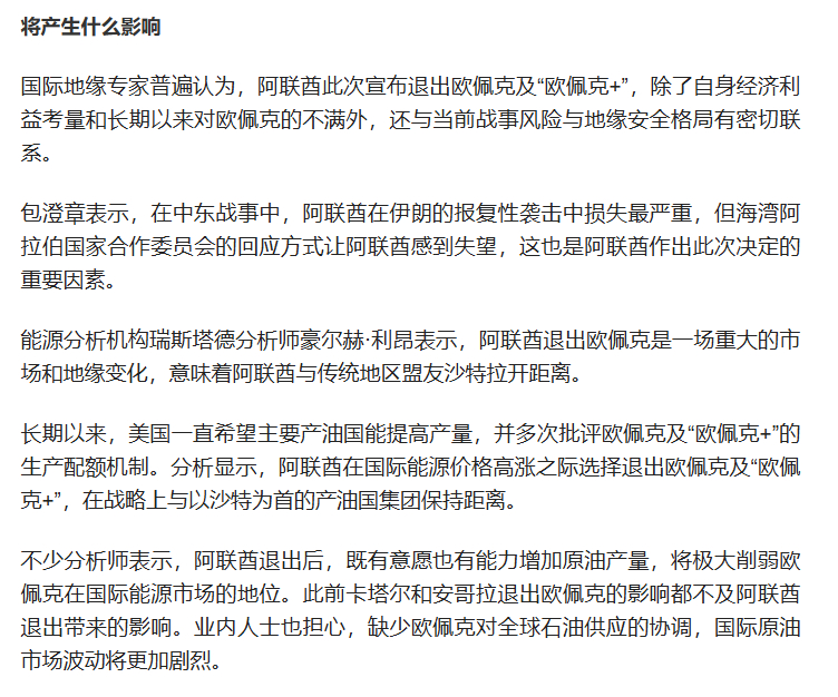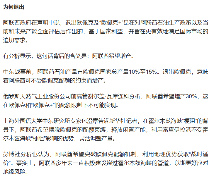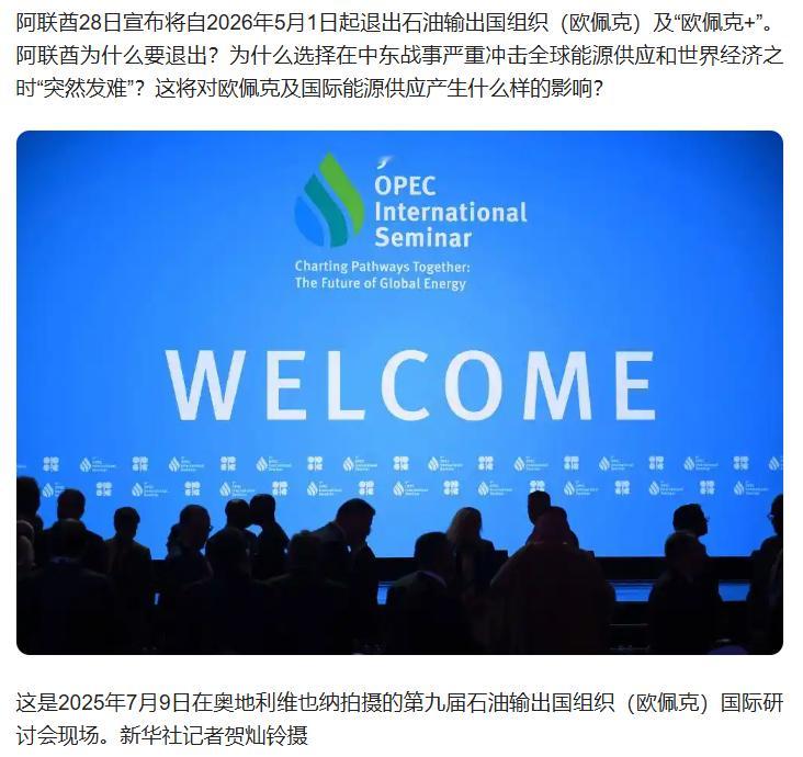【阿联酋为什么退出欧佩克及“欧佩克+”】阿联酋28日宣布将自2026年5月1日起退出石油输出国组织(欧佩克)及“欧佩克+”。阿联酋为什么要退出?为什么选择在中东战事严重冲击全球能源供应和世界经济之时“突然发难”?这将对欧佩克及国际能源供应产生什么样的影响?详戳↓↓(新华社)