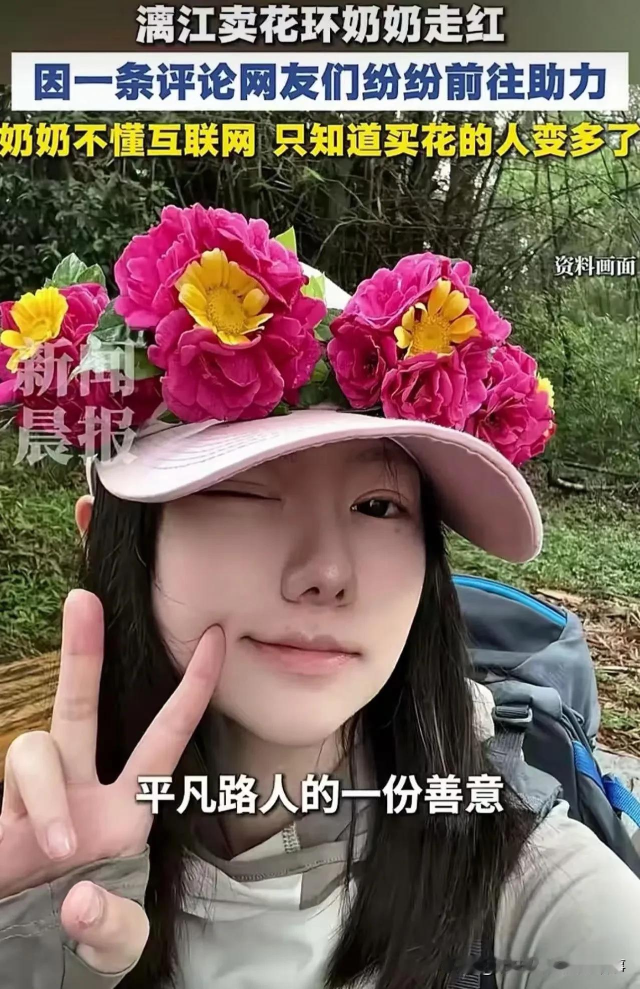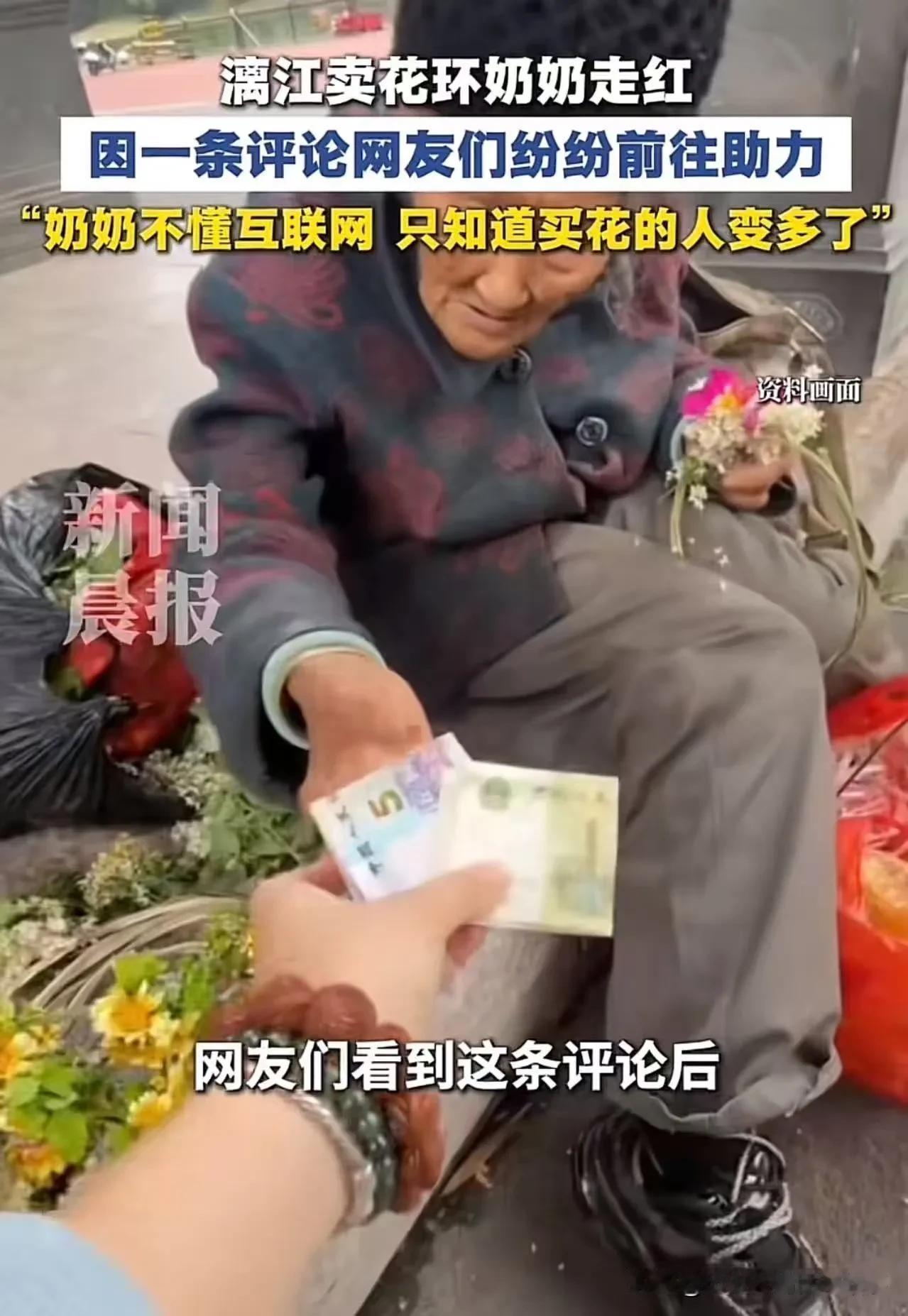 有游客看到老人年纪大、生意冷清,心生怜悯,拍了视频发上网,配文大意是:无儿无女、孤苦伶仃、靠卖花环糊口 。
