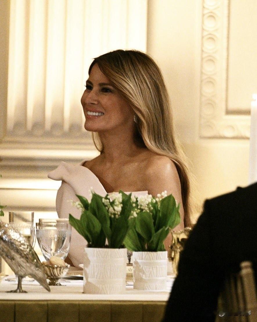 本场晚宴最亮眼的点缀,当属特朗普专属的鎏金餐盘,华贵金器映衬整场筵席,处处流光溢彩,尽显典雅隆重的王室气韵。