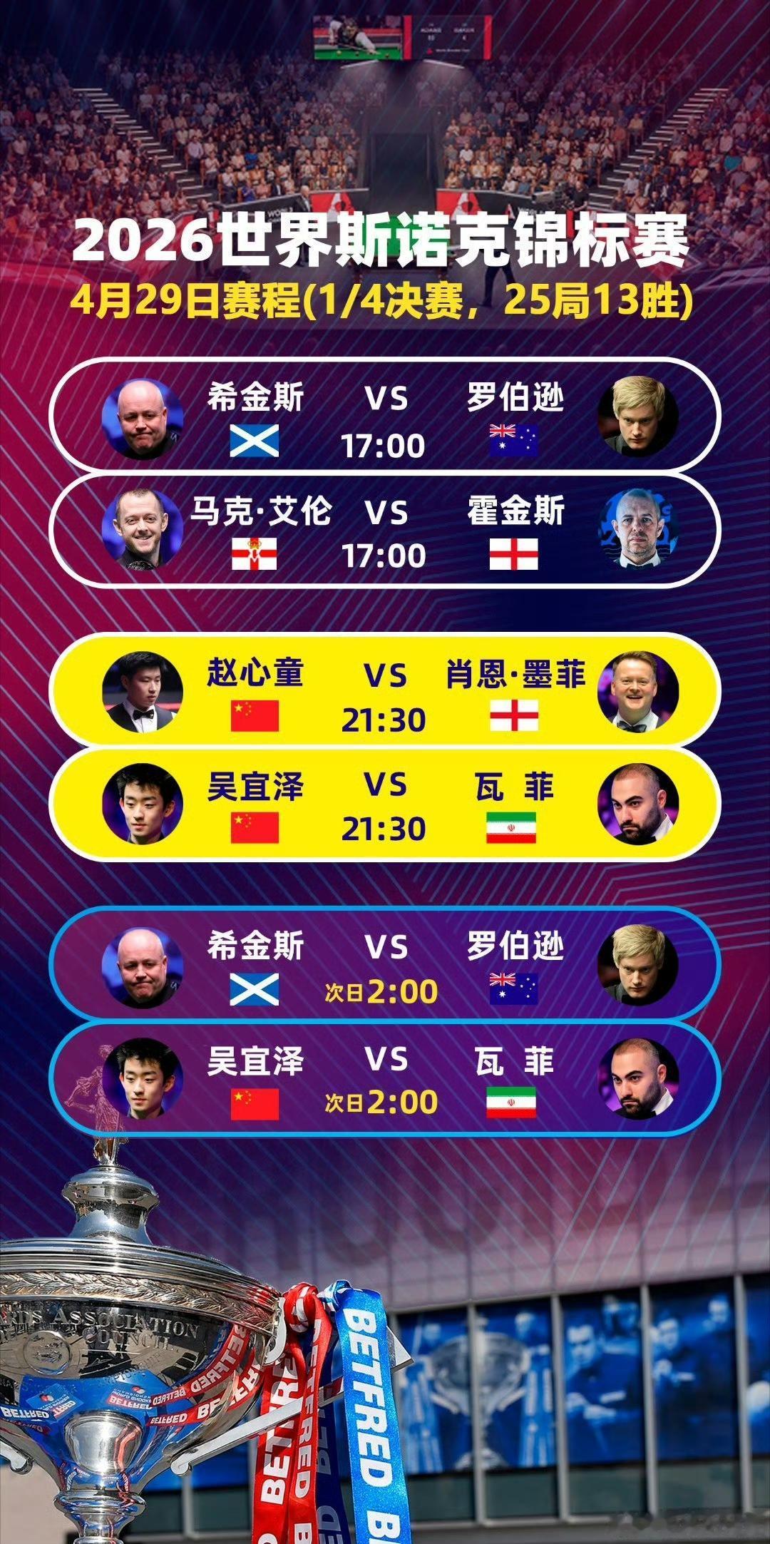 🇨🇳赵心童、🇨🇳吴宜泽冲击4强+冠军!中国双雄能否双双晋级?北京时间4月29日,2026年斯诺克世锦赛将展开1/4决赛第二个比赛日的较量,2名中国选手🇨🇳赵心童、🇨🇳吴宜泽强势出战。稍早前的第二轮,他们两人以13-9、13-11淘汰了丁俊晖、塞尔比携手晋级八强,与希金斯、墨菲、罗伯逊、霍金斯、艾伦、瓦菲等争夺四强门票。今天凌晨结束的1/4决赛首个比赛日,🇨🇳赵心童、🇨🇳吴宜泽以8-8(第二阶段)、4-4(第一阶段)的比分战平墨菲、瓦菲,他们都有机会晋级四强,前提是要有出色发挥。另外,“小钢炮”艾伦在第二阶段以8-8与“霍师傅”霍金斯战平,而“墨尔本机器”尼尔-罗伯逊以5-3领先”巫师”约翰-希金斯。即将开始的比赛,赵心童从21:30展开五墨菲的第三阶段,赵公子必须走出前两个阶段的低迷。而吴宜泽必须打出淘汰塞尔比时的良好状态。期待他们的好消息!赵心童 吴宜泽