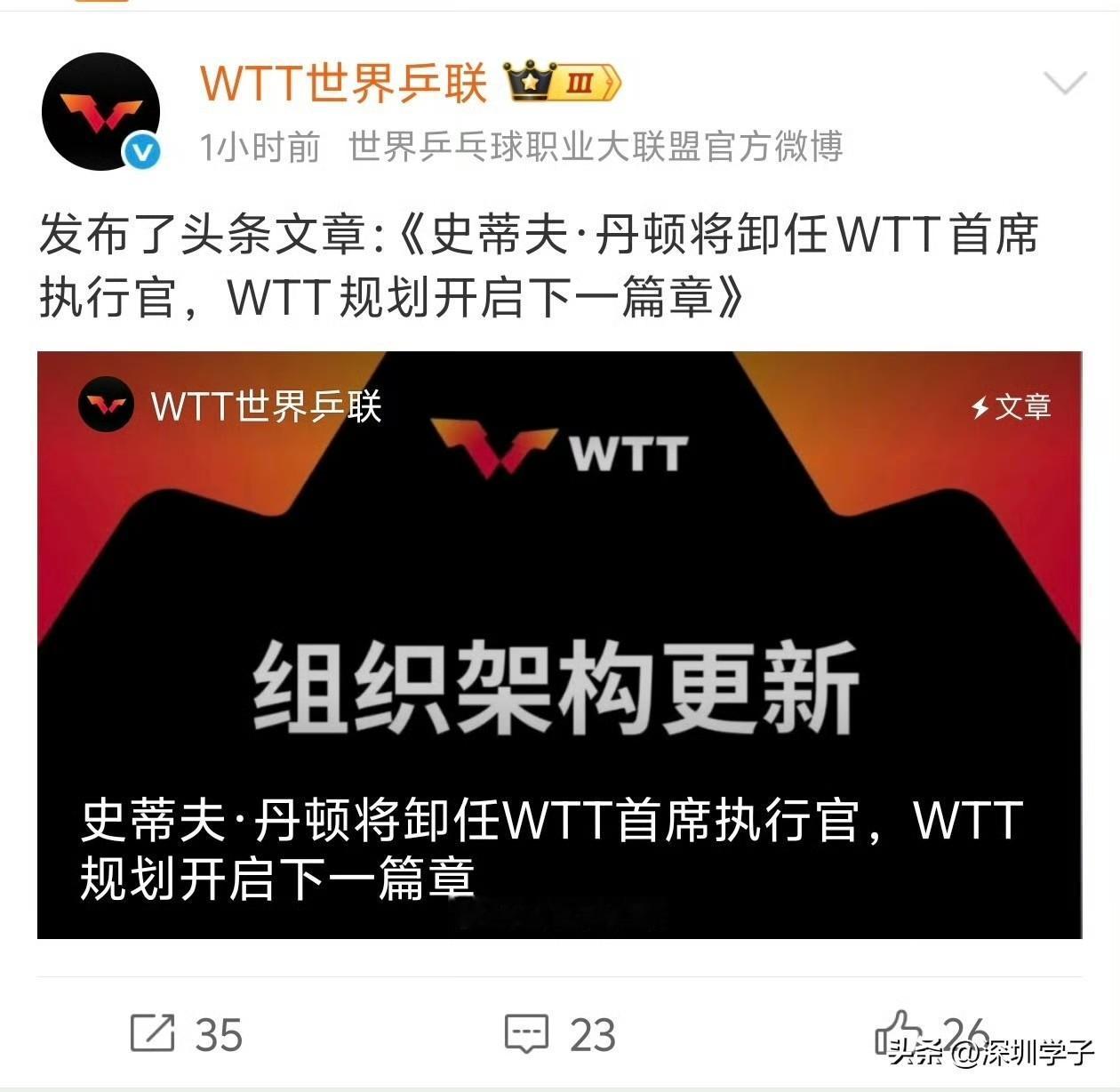 2025年11月19日才宣布丹顿专职WTT首席执行官职务,今天,2026年4月29日就宣布卸任。这是不是历史上最快的卸任?
