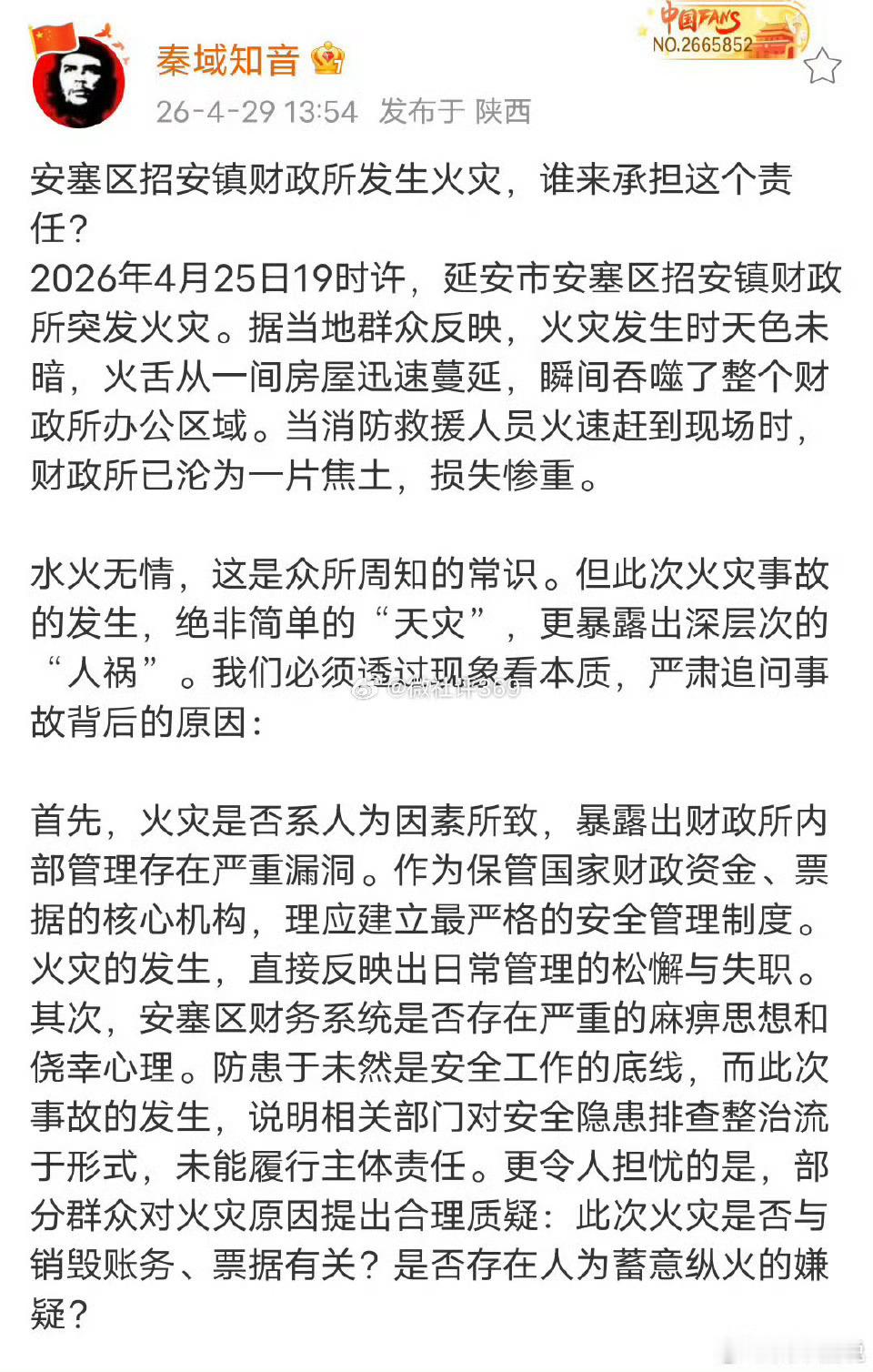 首先,火灾是否系人为因素所致,暴露出财政所内部管理存在严重漏洞。作为保管国家财政资金、票据的核心机构,理应建立最严格的安全管理制度。火灾的发生,直接反映出日常管理的松懈与失职。其次,安塞区财务系统是否存在严重的麻痹思想和侥幸心理。防患于未然是安全工作的底线,而此次事故的发生,说明相关部门对安全隐患排查整治流于形式,未能履行主体责任。更令人担忧的是,部分群众对火灾原因提出合理质疑:此次火灾是否与销毁账务、票据有关?是否存在人为蓄意纵火的嫌疑?