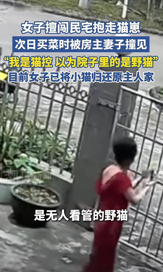 面对质问,女子一开始可能有点慌,但很快就给出了解释,她说自己特别喜欢猫,是个“猫控”,当时看到小猫在院子里,觉得没人管,就以为是没人要的野猫,她觉得自己是出于好心,想把猫抱回去收养,不是故意要偷别人的猫。