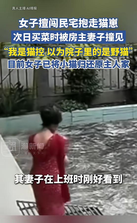 从监控画面里能看到,这名女子穿着红色的连衣裙,她走到院子门口,没犹豫也没敲门,直接就走了进去,当时小猫就在院子里待着,她上前一把抱起小猫,没多停留,转身就离开了,整个动作很干脆,看起来不像是误闯。