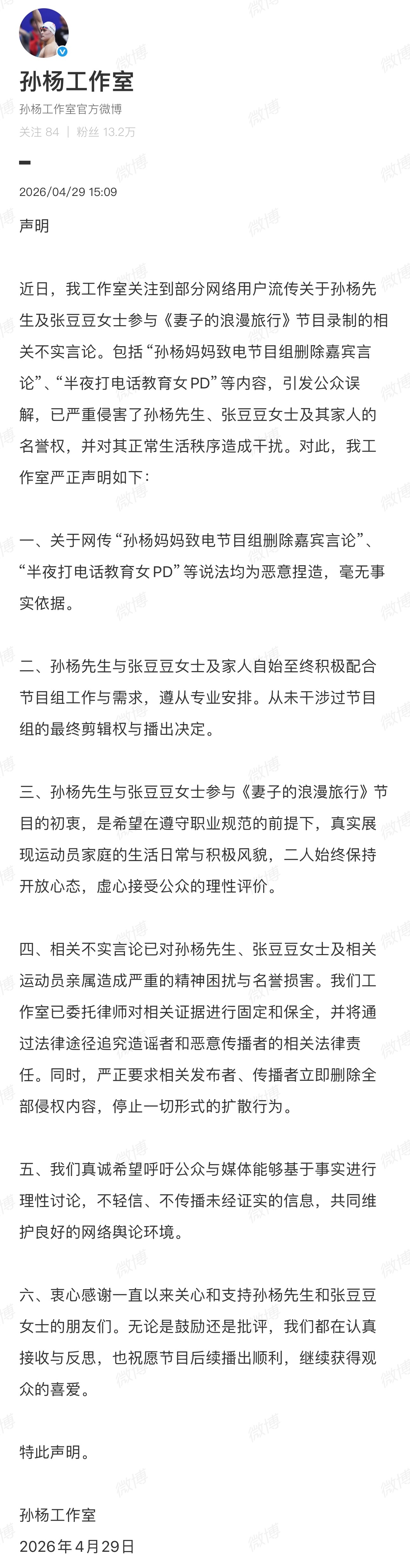 孙杨工作室澄清声明孙杨工作室回应网传为不实言论4月29日,孙杨工作室发布正式澄清声明,针对网传家属干涉节目剪辑、致电节目组施压等相关传闻进行严正辟谣。明确此类内容均为恶意捏造,毫无事实依据。孙杨及家人全程配合节目录制,尊重剧组专业安排,将依法追责造谣行为,抵制不实造谣与恶意抹黑,维护合法权益。