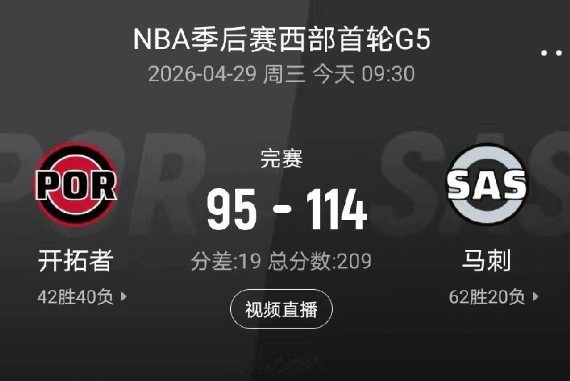 4月29日,常规赛第5场,开拓者队以95-114不敌马刺队,大比分1-4被淘汰出局,结束了本赛季征程。