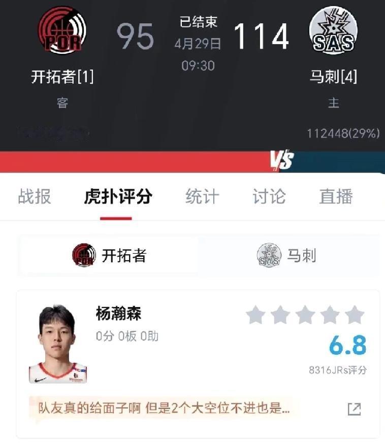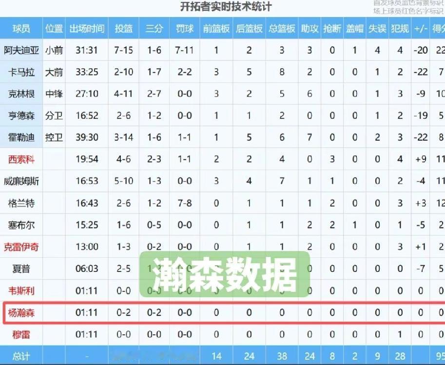 小杨垃圾时间上场1分11秒,2投0中,三分2投0中,其它所有数据全部挂零,唯一贡献就是,小杨在场上,球队没丢分,因为正负值也为0。