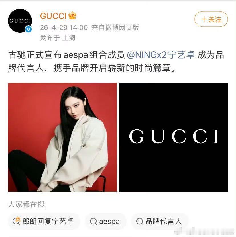 宁艺卓GUCCI内外网同步官宣GUCCI官宣宁艺卓 宁艺卓半年内从活动刷脸到内外网同步官宣最高title,GUCCI待遇出众,你们觉得这份同步官宣能体现她的全球认可度吗?